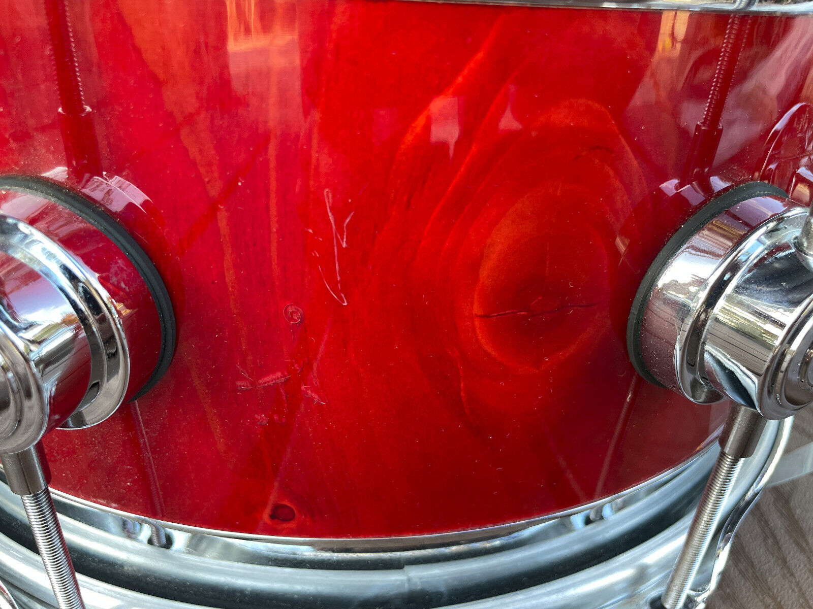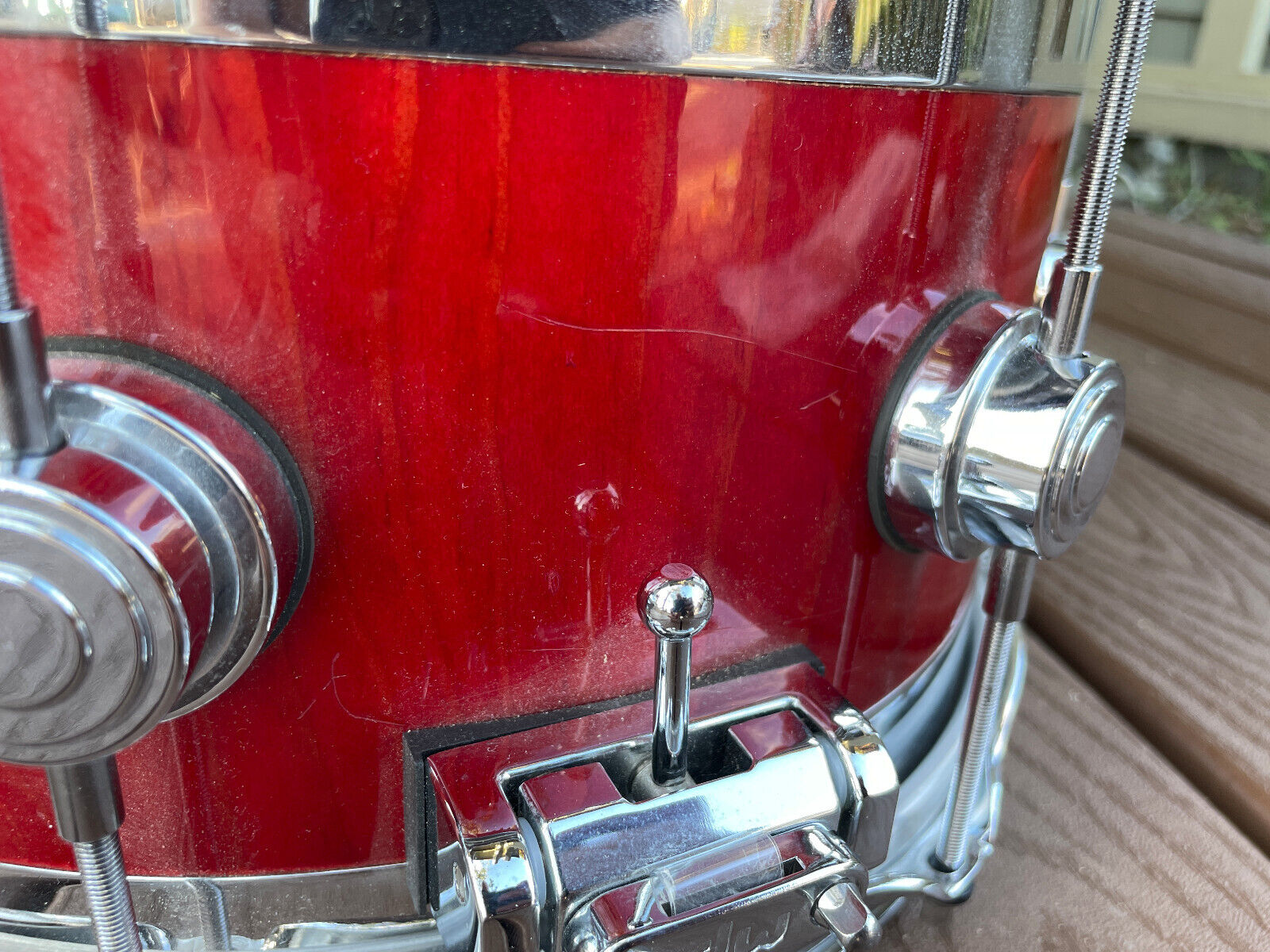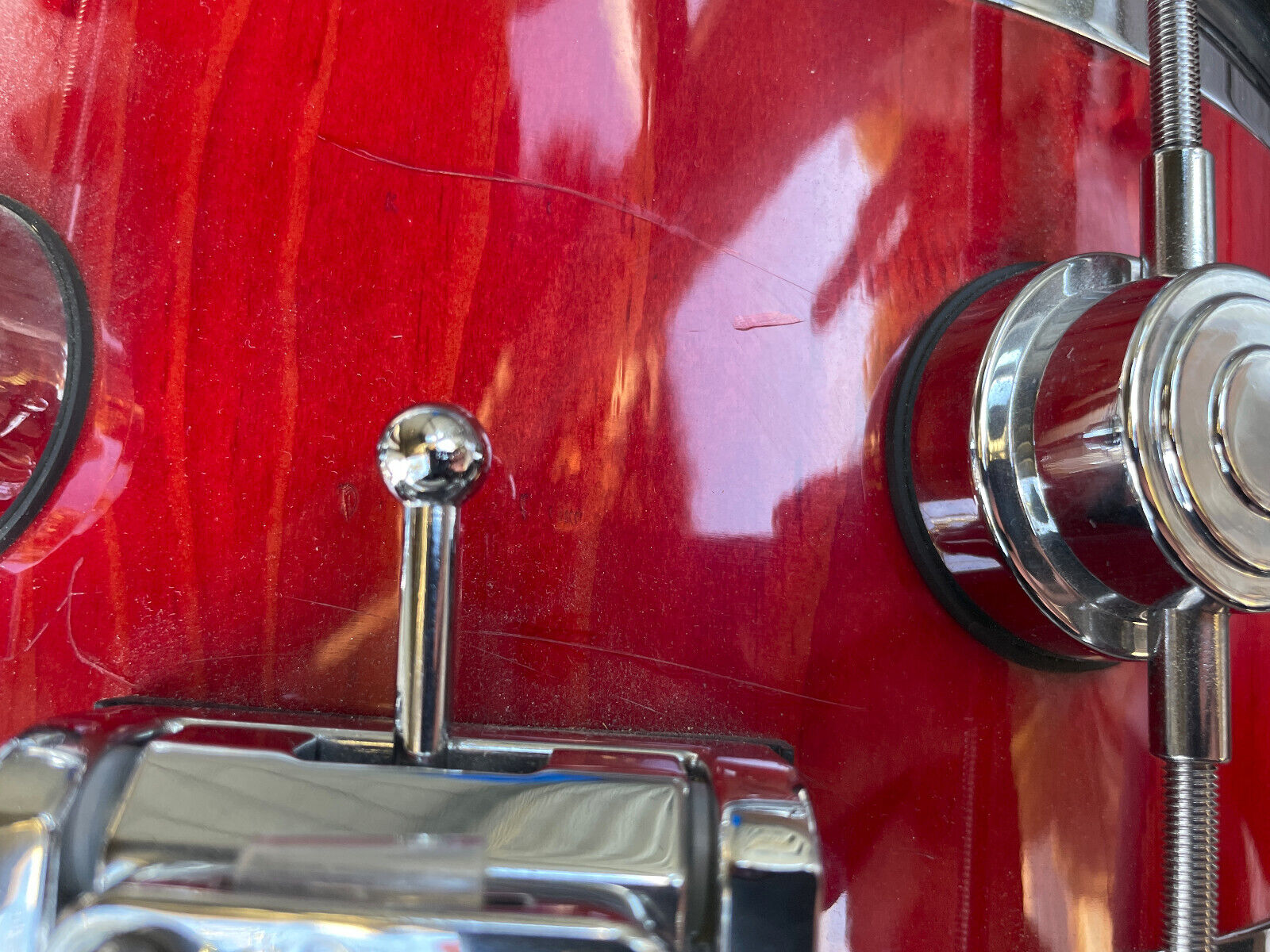 Overall the snare is in very good condition . There is what looks like some fine scratches on the outside finish (see pictures) . Not sure if they are normal from age on the clear coat or fine scratches but otherwise the snare looks great and are minor . A couple marks on head but original tag still on snare. The original throwoff was changed so there is a hole where the last throw off was (see last picture)