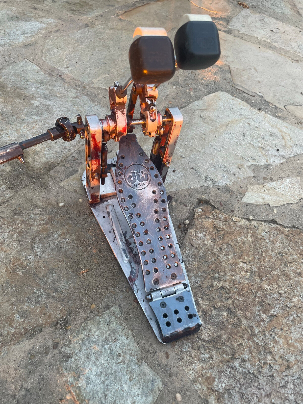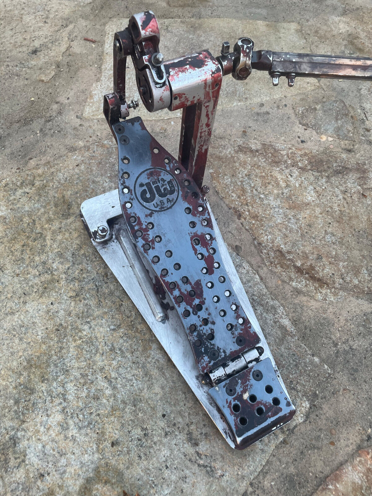 This pedal was originally painted all red but I made it a custom chainsaw halloween serial killer finish. If you like you can remove the rest to get it back to original but has fine scratches on footboard. Looks cool though!! See pictures for condition