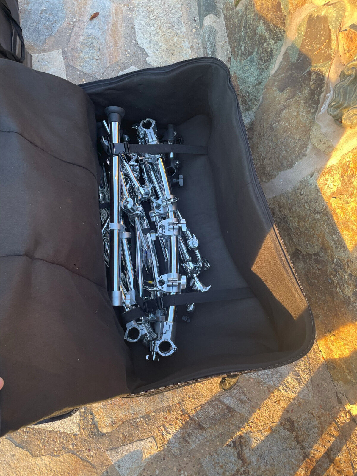one case the rack can be broken down into with a bass drum on top and the other is for cymbals and module
