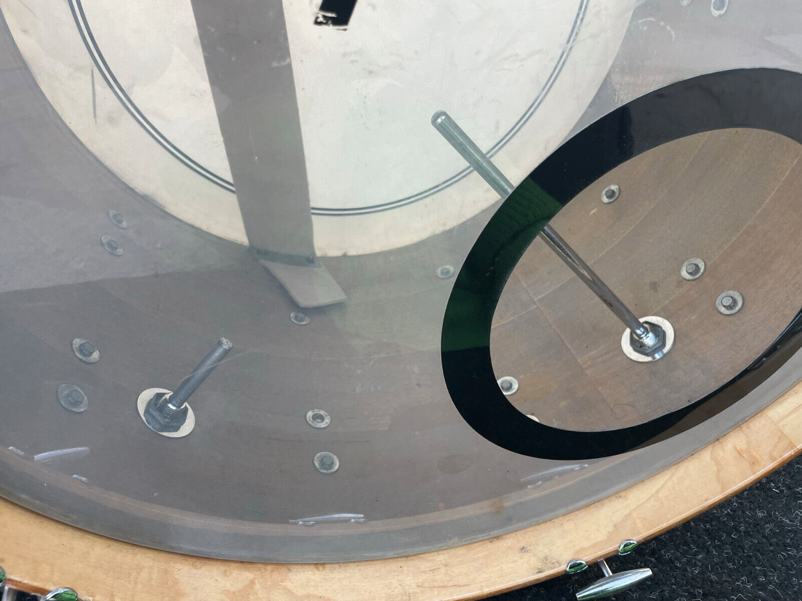 One of the bass drum spurs is shorter and not original. This can be replaced . Also after these photos were taken i noticed one floor tom leg brackets wouldnt tighten properly, so I ordered a new floor tom leg mount and found out it is a smaller hole than the original. it works with a smaller leg that is included but ill include the other original leg and original mount but you could replace this down the road or they also have newer version of the diamond mounts that would fit that you could buy so not a huge issue. Some of the wood on the inside looks a little dark but this appears to be normal age and a couple of the drums the natural finish the "shine" of the natural finish looks a little faded from age also (could just be it needs wood polish)