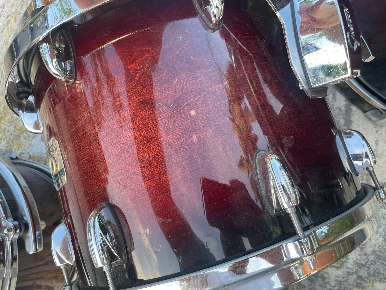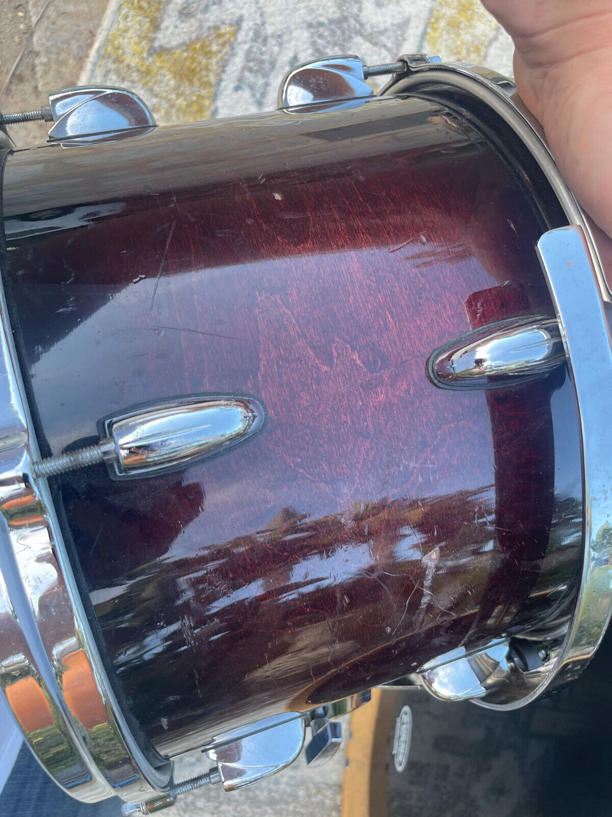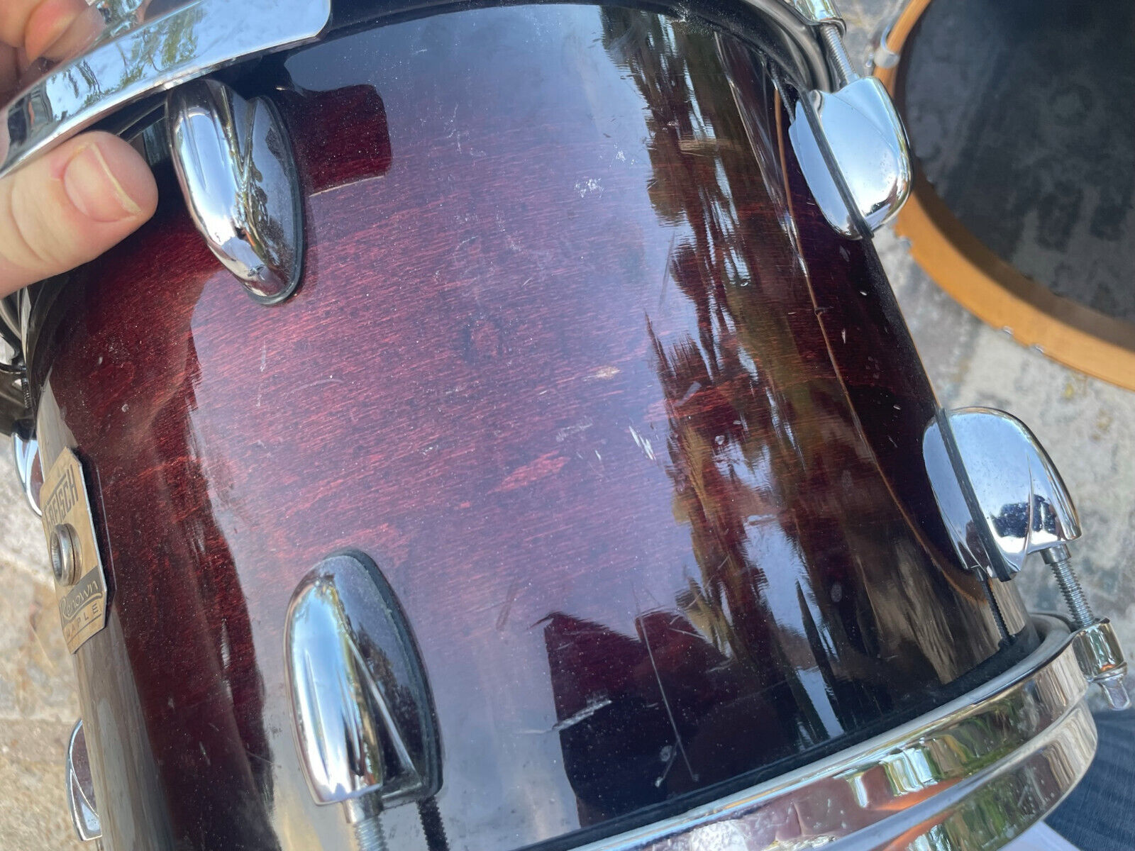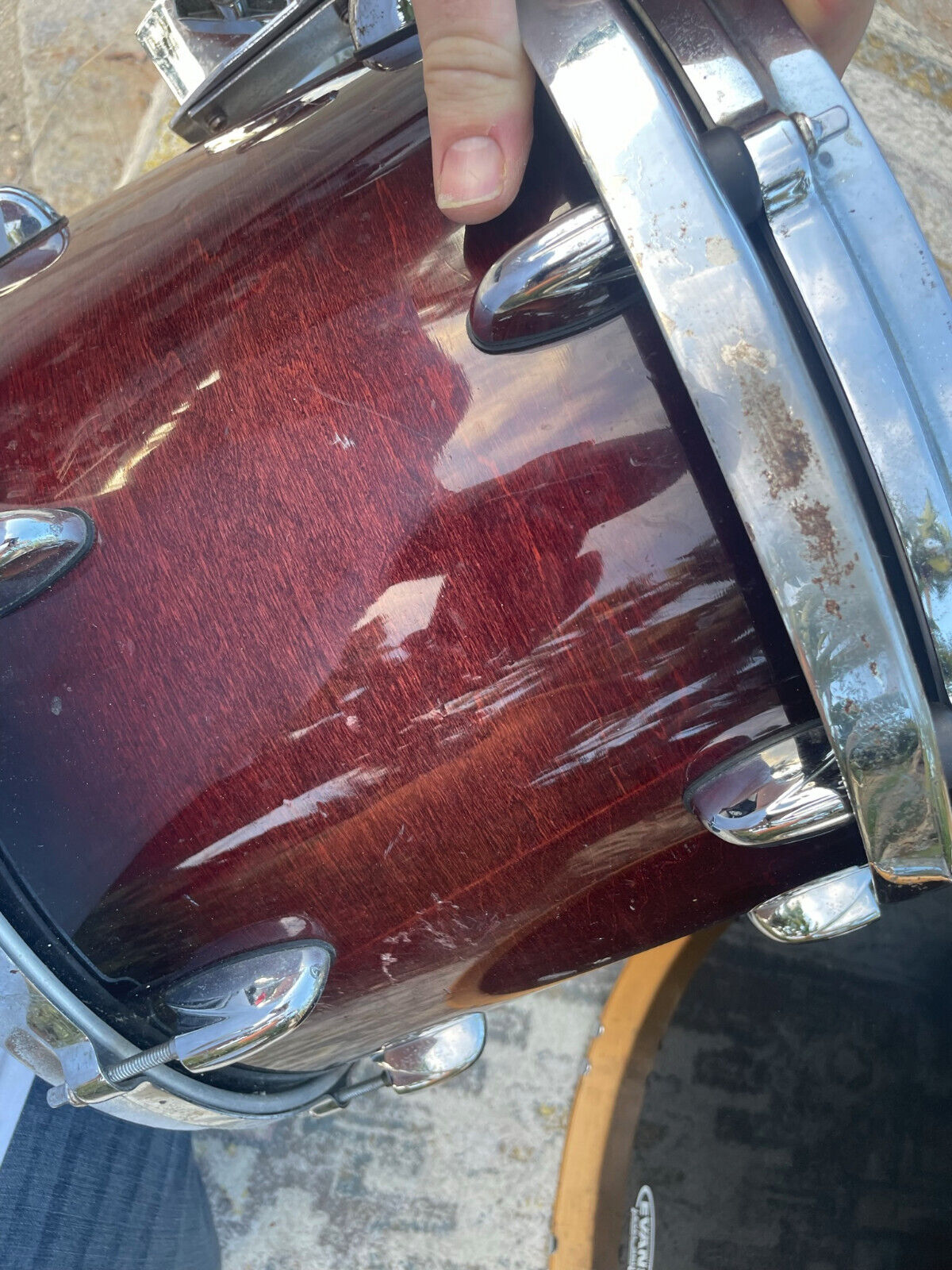 These are great sounding drums but the shells are in fair cosmetic condition. Scuffs - scratches - marks - blemishes. Inside shells are fine though but yeah its pretty worn cosmetically. Also missing mounting bracket. Some flaking on the chrome . See pictures for condition