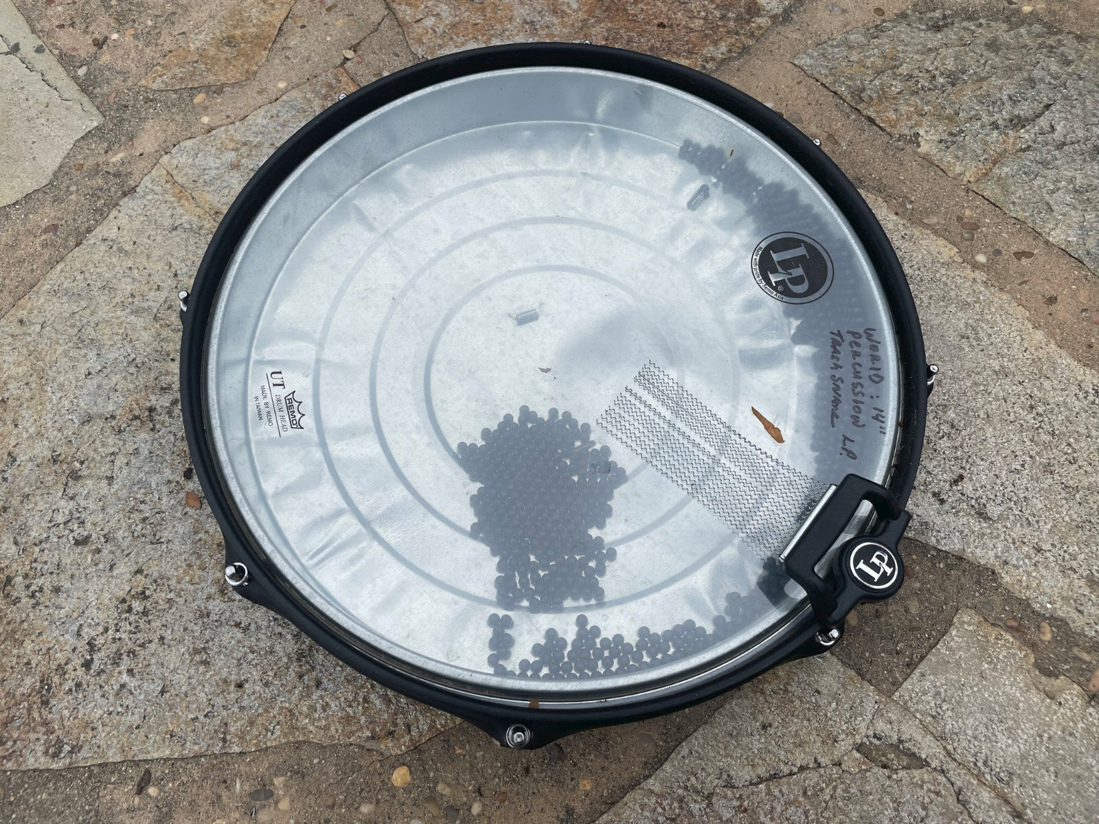 Latin Percussion LP1601 RAW Trash Snare. VG condition. One snare wire came off after I took the picture but works fine