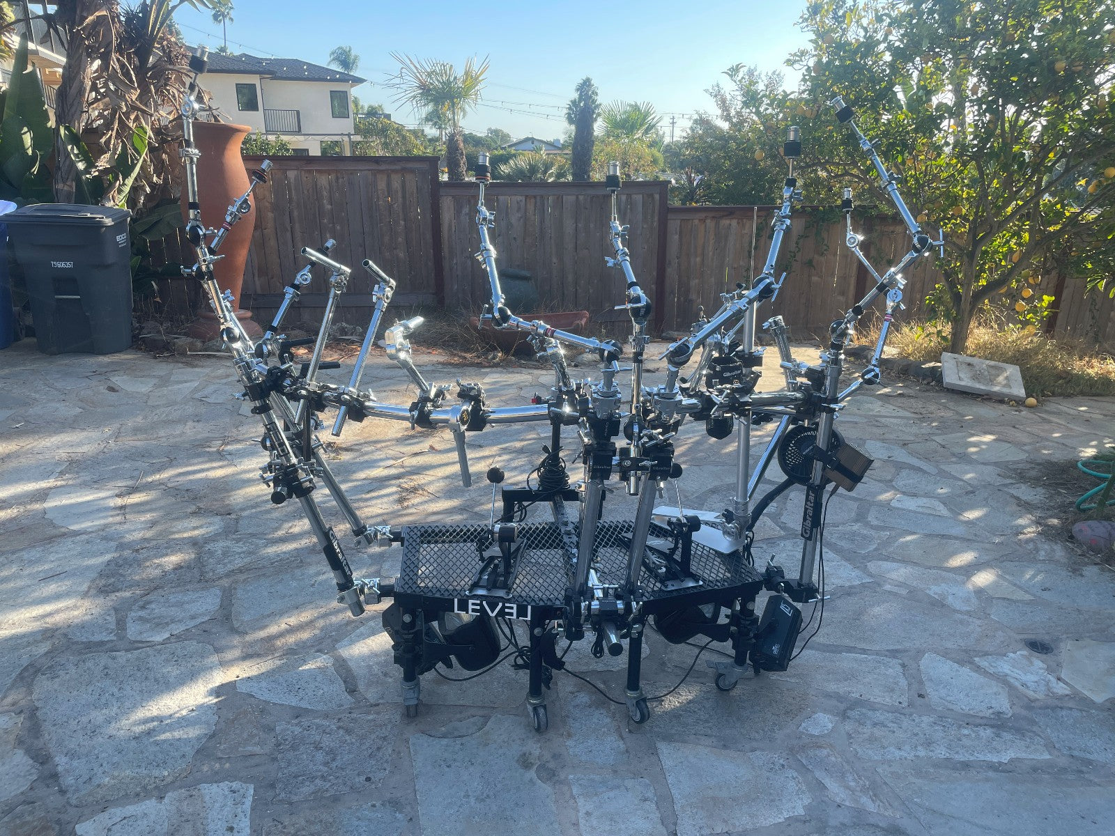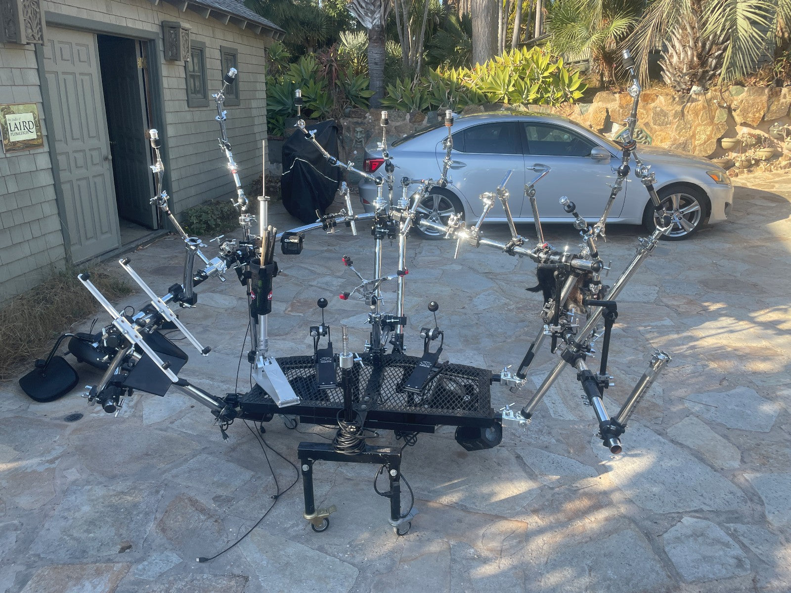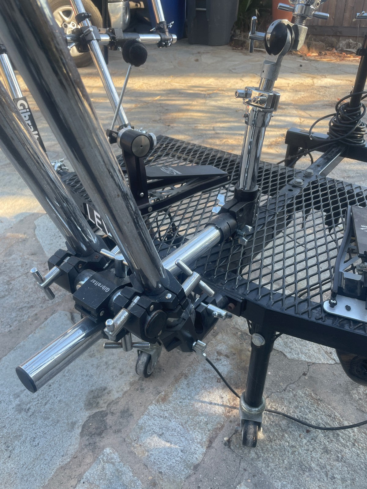 So basically it can accommodate an entire double bass kit , a drum module , a tablet, cowbells, concert / octo toms, a gong etc. My friend even had a floor tom underneath the hi hat with 4 octo toms at one point. Currently outfitted with pearl arms and they are included. One wheel was spray painted gold as my friend was thinking about making all the wheels gold colored but decided against it thats why one of them is that color. Could possibly be removed.