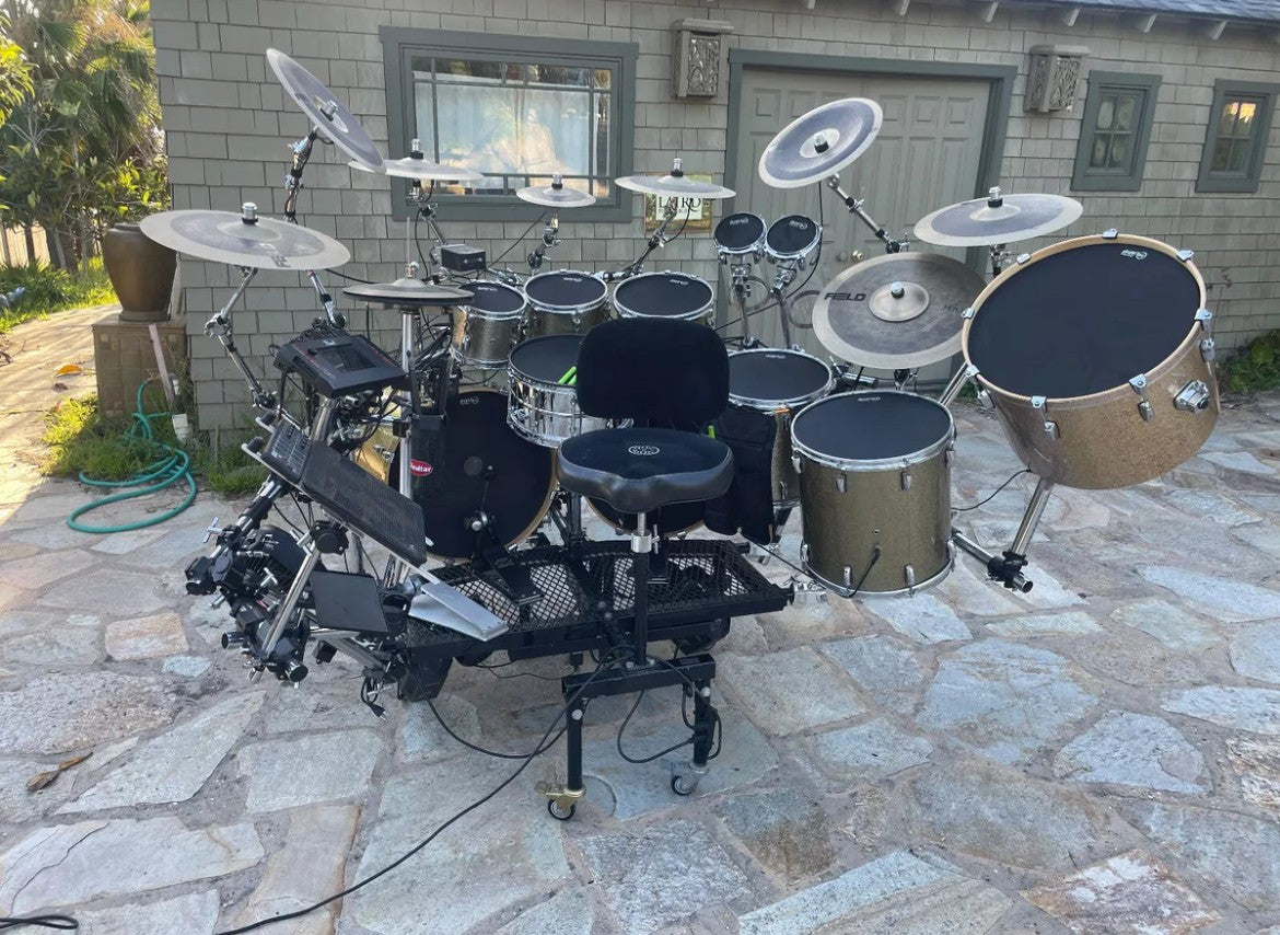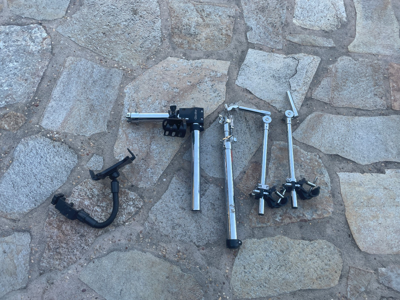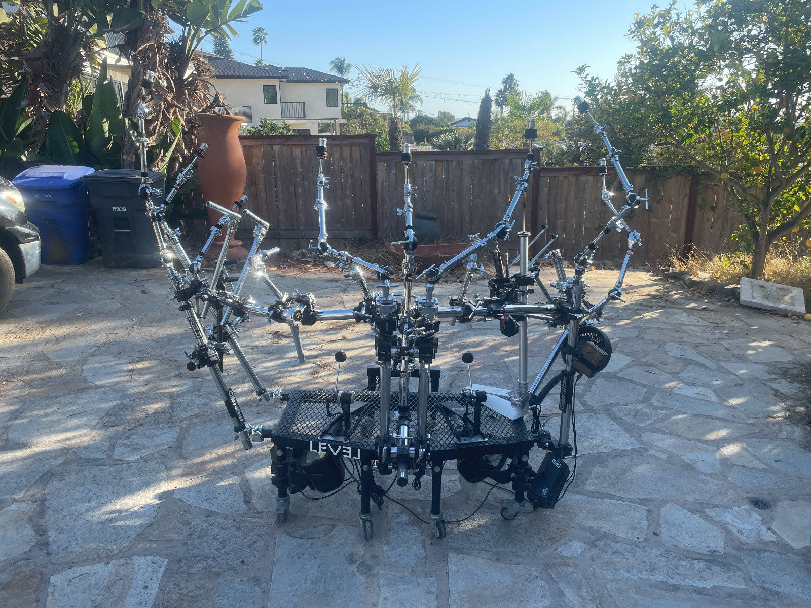 So basically it can accommodate an entire double bass kit , a drum module , a tablet, cowbells, concert / octo toms, a gong etc. My friend even had a floor tom underneath the hi hat with 4 octo toms at one point. Currently outfitted with pearl arms and they are included. One wheel was spray painted gold as my friend was thinking about making all the wheels gold colored but decided against it thats why one of them is that color. Could possibly be removed.