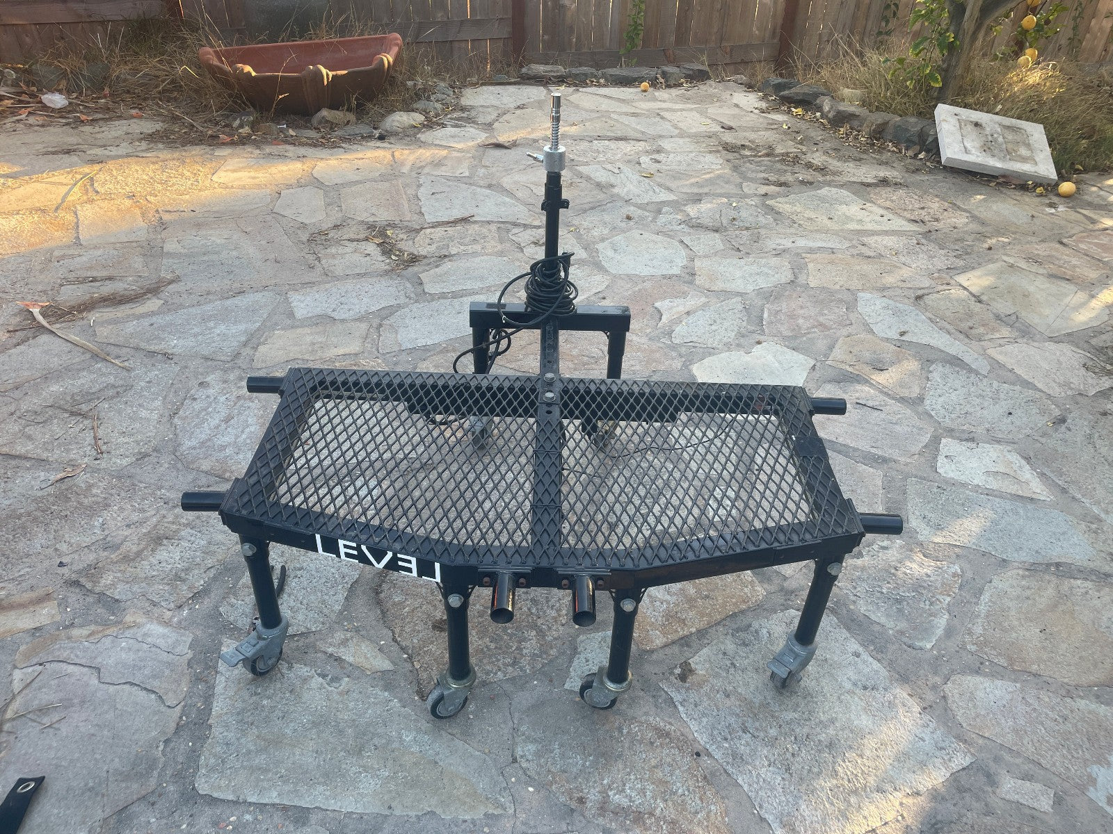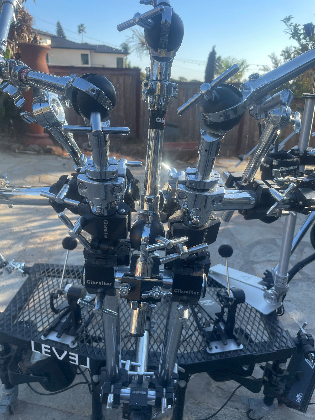 This huge and insane Level drum rack comes with gibraltar bars that can accommodate some of the largest drum setups!! This rack was originally built by a good friend of mine who ended up getting cancer . He had a electronic kit setup on this originally as shown in the last pics.