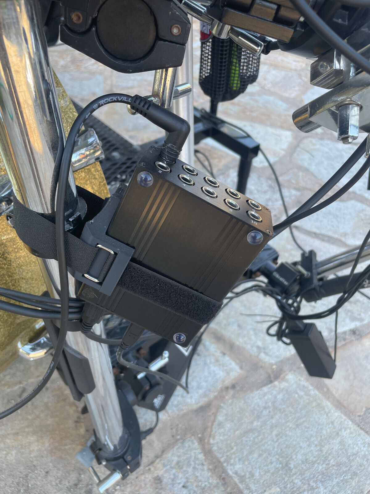 The module is the flagship Pearl Mimic with an added Edrumin 10 ….it is a midi to trigger converter which gives you 10 extra outputs. The rest are triggered using splitters splitting the rim and piezo or turning the kicks into two by using single trigger splitters (which turn one trigger into two with the same sound).
