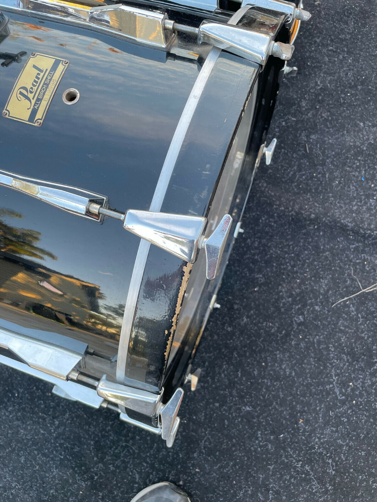 Drums are in good condition. They have been played. They have some scratches here and there. Some rub marks on hardware and minor oxidation/pitting .
