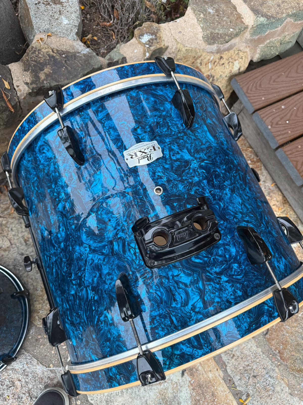 Excellent condition. A minor bubble spot on the bass. Has two black pearl arm holders but you need 2 more for the lower toms