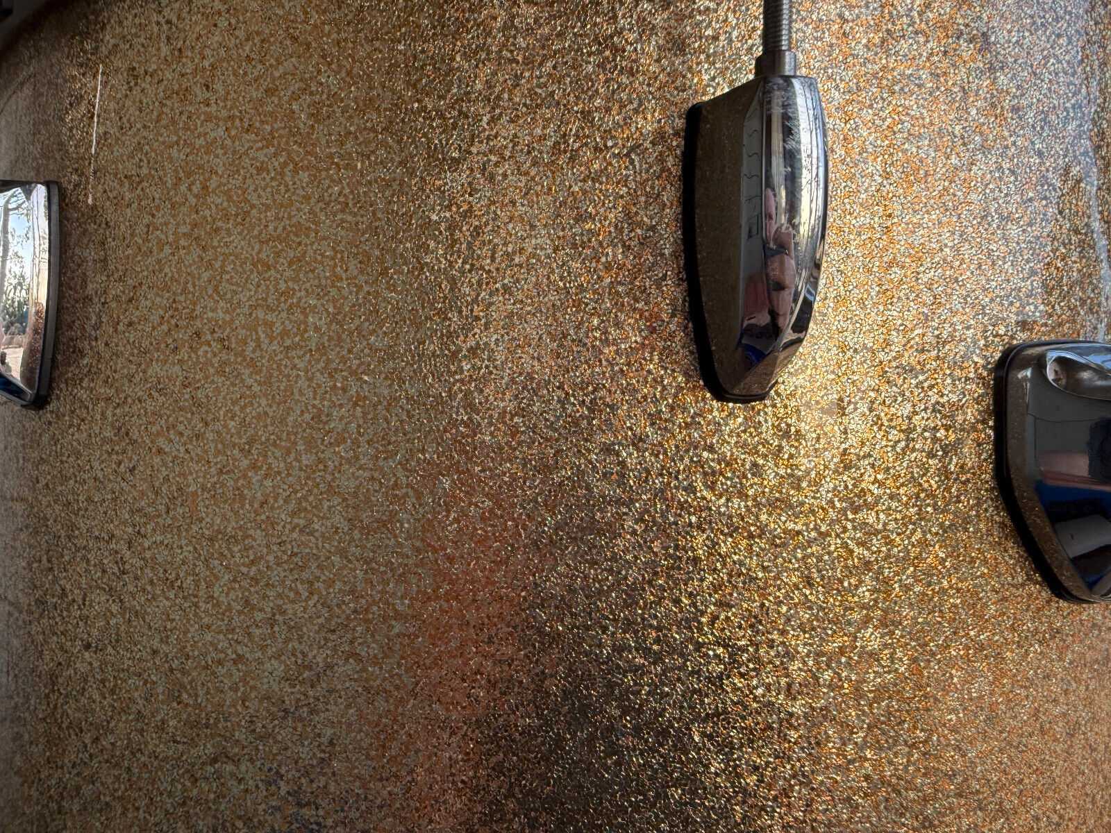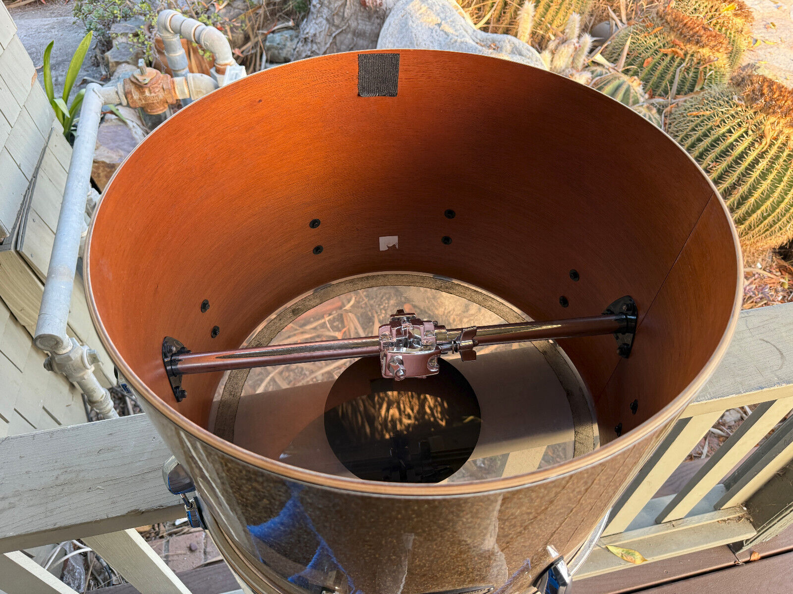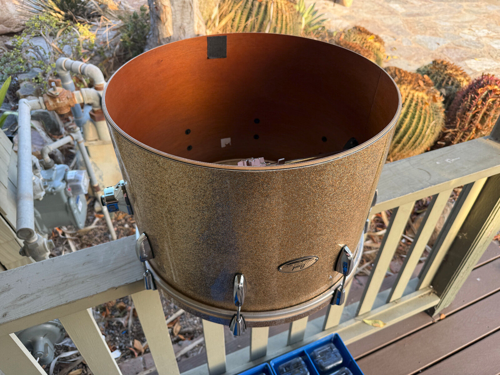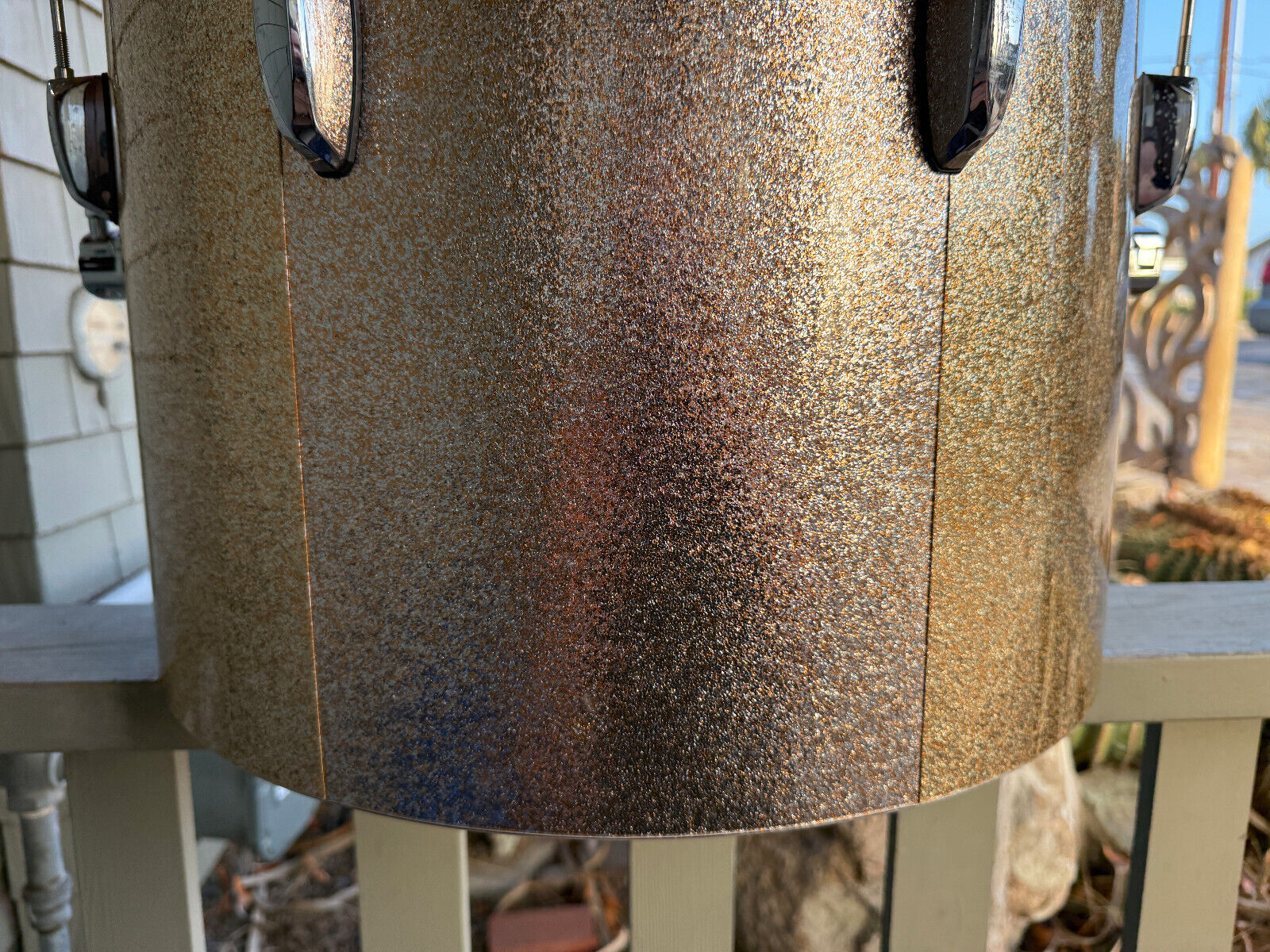 This gong has been rewrapped in Champagne sparkle. There is some inconsistencies in the wrap and finish from age . See pictures of the seams and condition.