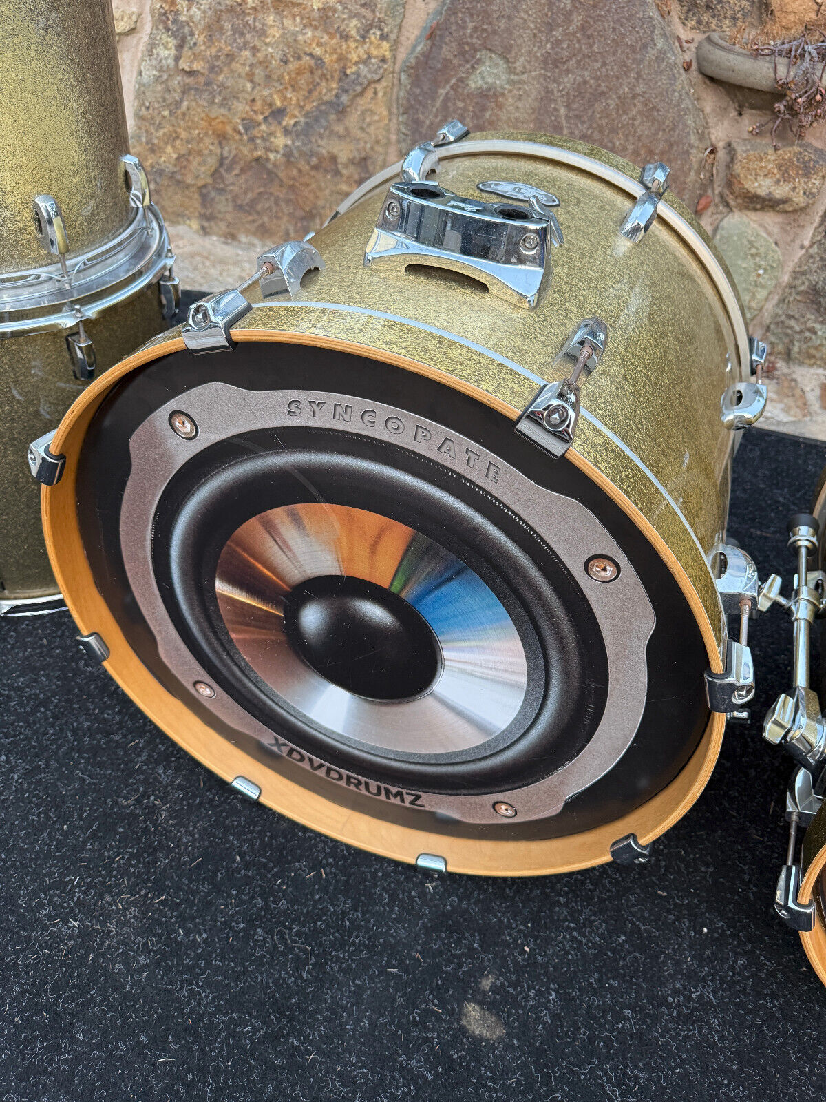 VG  with some normal wear here and there. The wrap has some age on the finish so there is some variance on the color on them. Also the 8,10 and 14 inch toms do have extra port holes but i plugged them with extra grommets from when these were used as a electronic set. There may be some tape on some of the rims but can be removed.  I have 3 floor tom leg mounts but the 14 and 16 were converted into hanging tom with Opti Mounts.