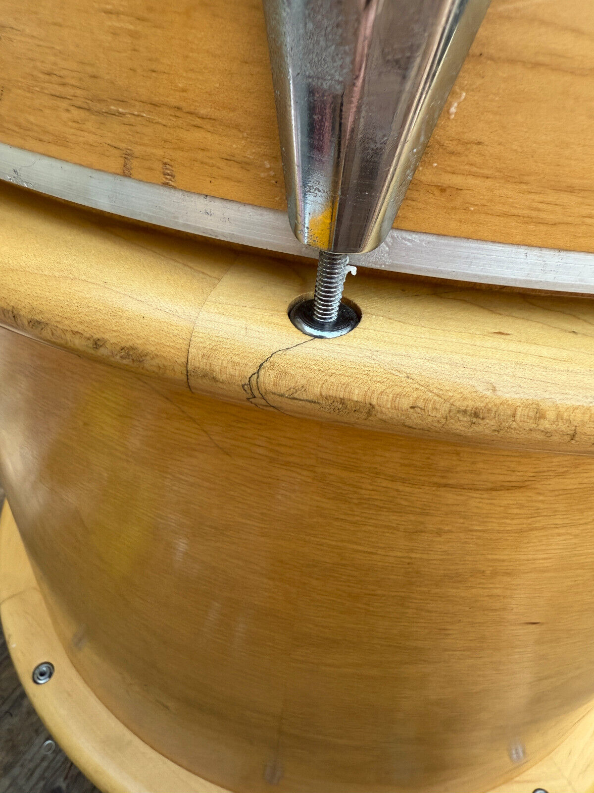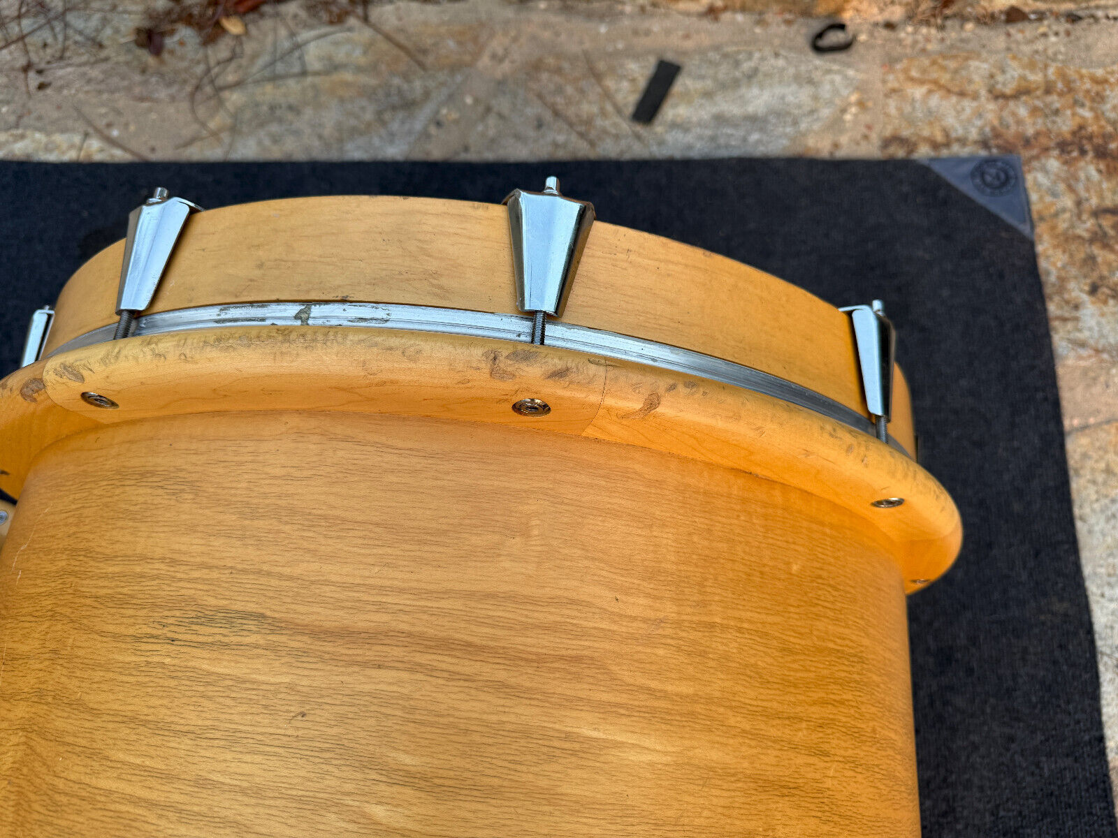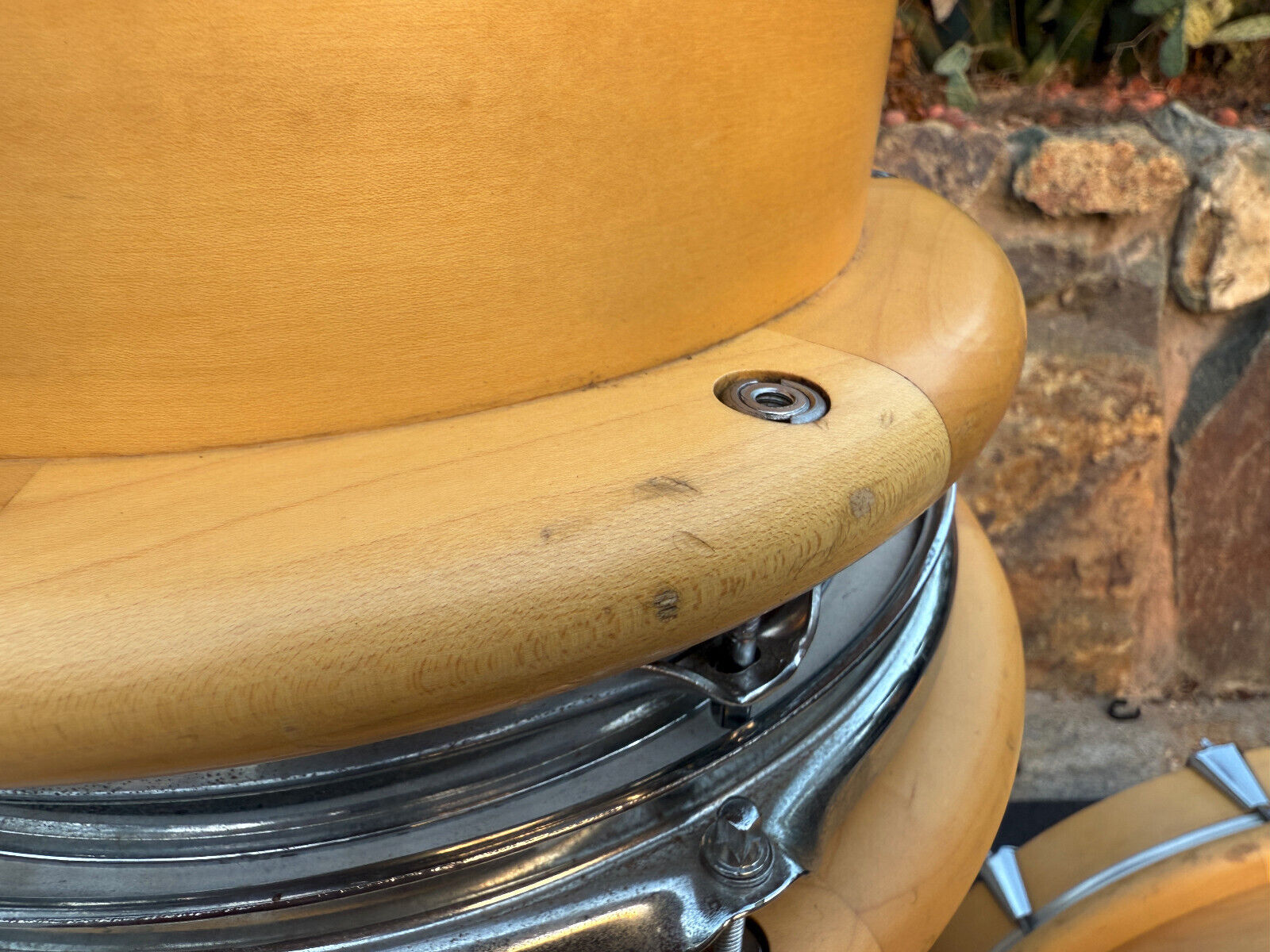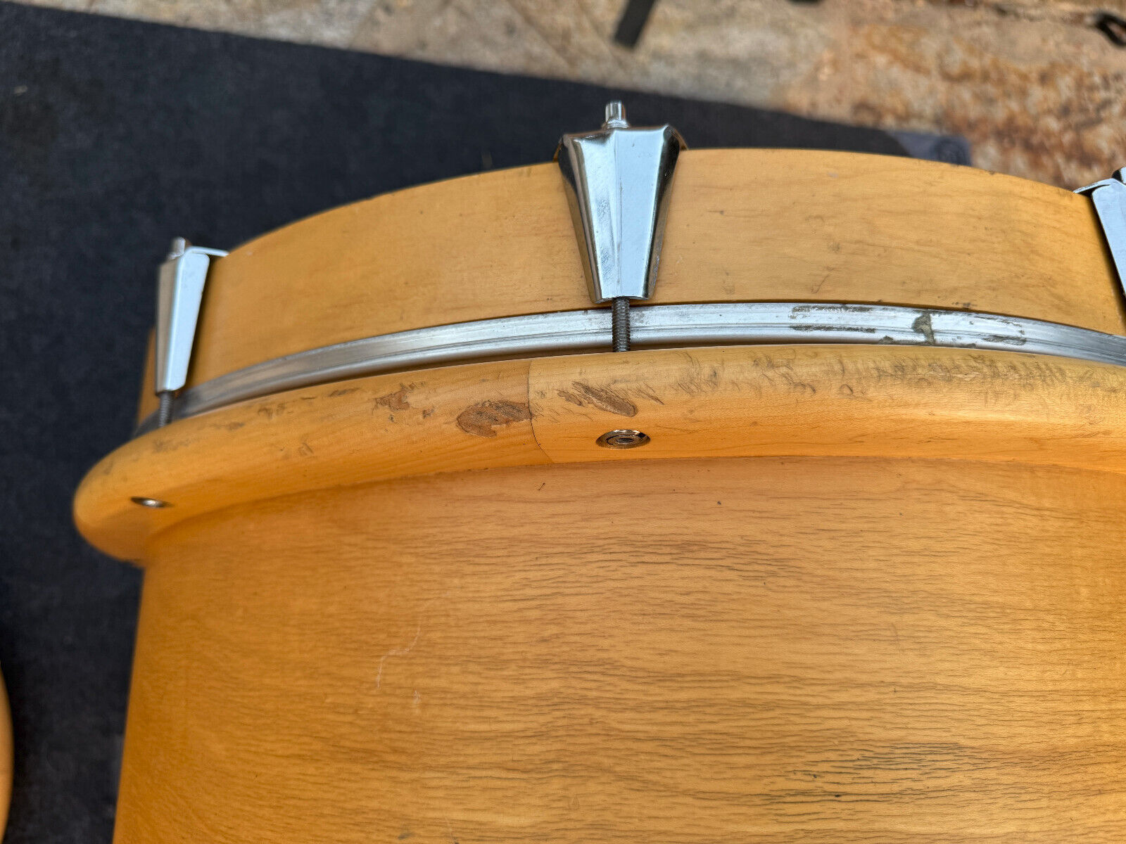 Condition wise this kit is used and has expected wear for a 30+ year old kit. . It has several marks and rub spots. I would say the most is on the bass drum. Has several along the outer bass rings. Players kit . All interior shells are inspected and in great shape. A couple hairline spots on the rings on the bass drum ( see pictures) but doesnt look like it effects anything and the bass drum spurs bolts were replaced so there is a little bit of wiggle room on those. I assume this would be normal for them to not be 100% tight and to have a little play but those screws could be changed. . But this is a great kit .