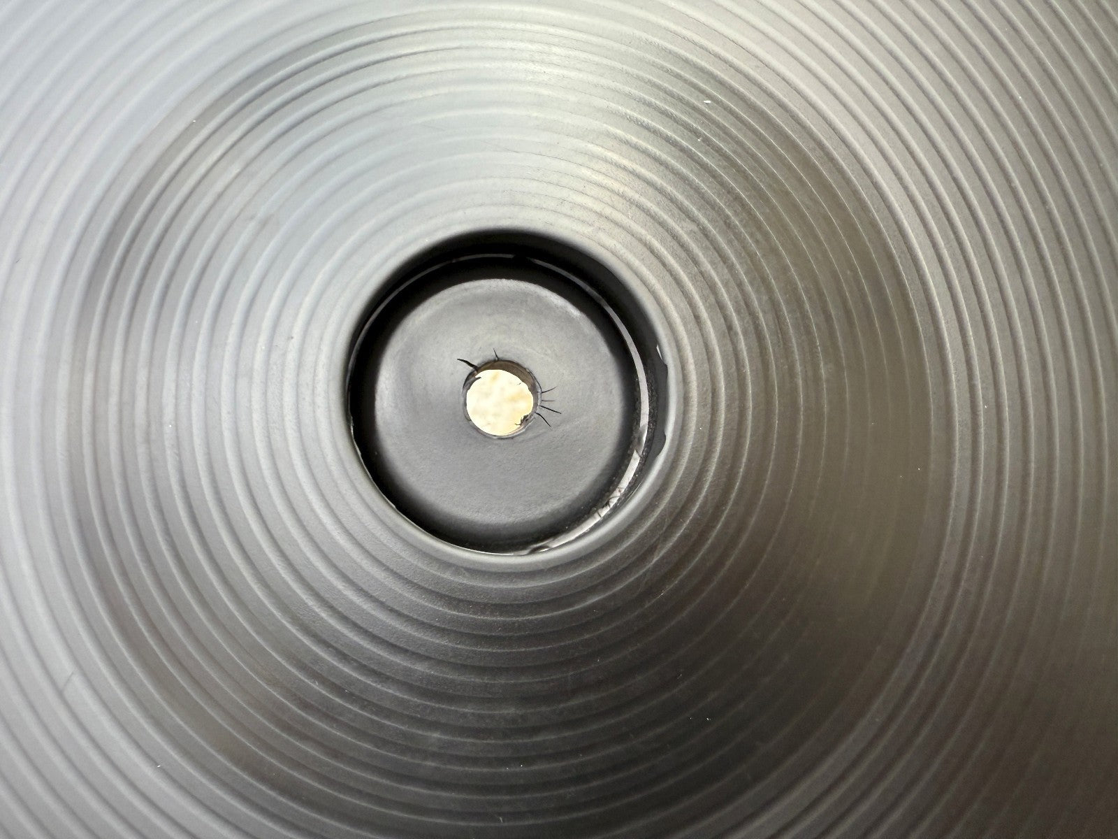 The cymbal is in very good condition. Some minor ribber splitting around keyhold but only minor. A little wear but looks good. I am