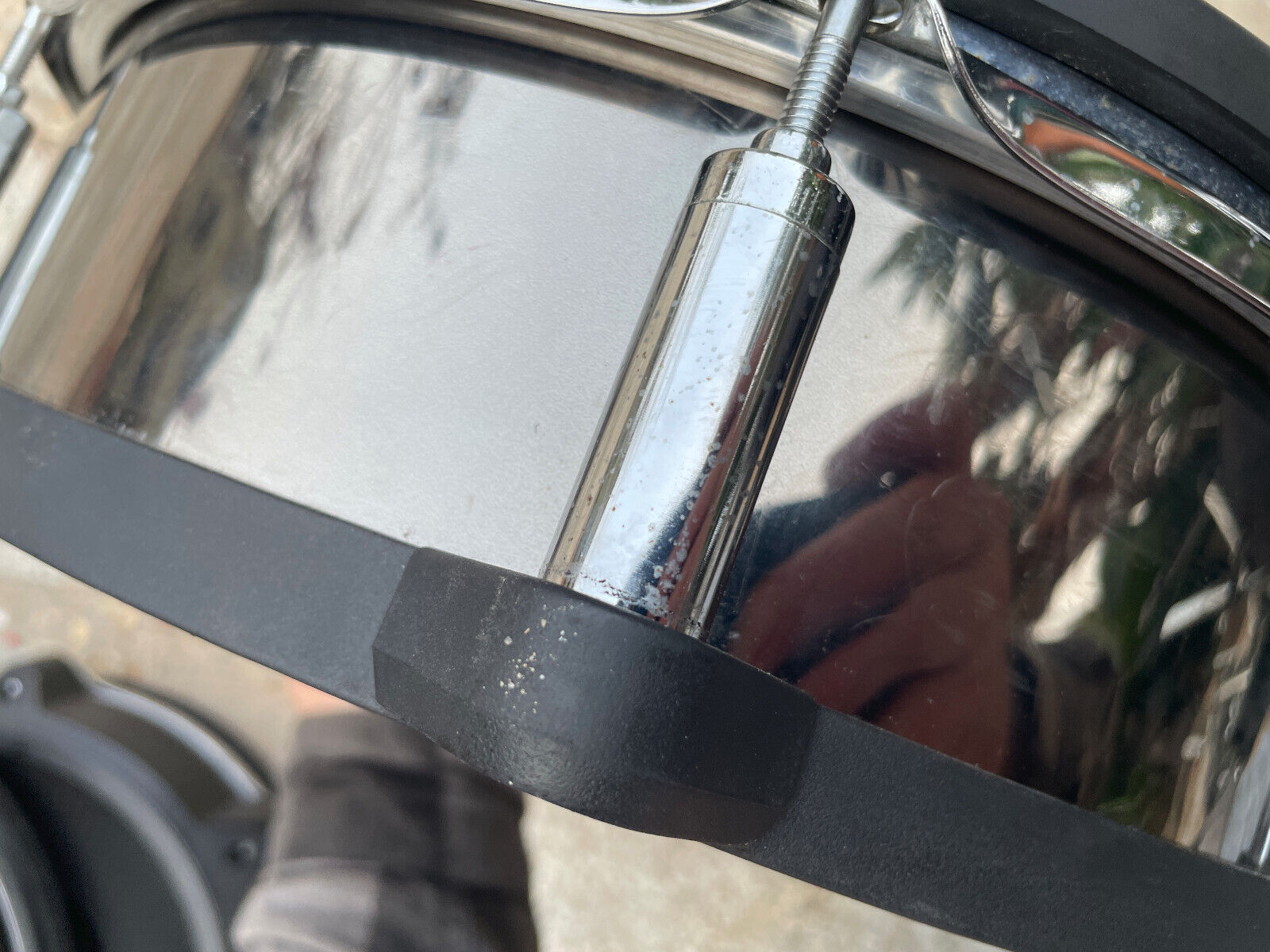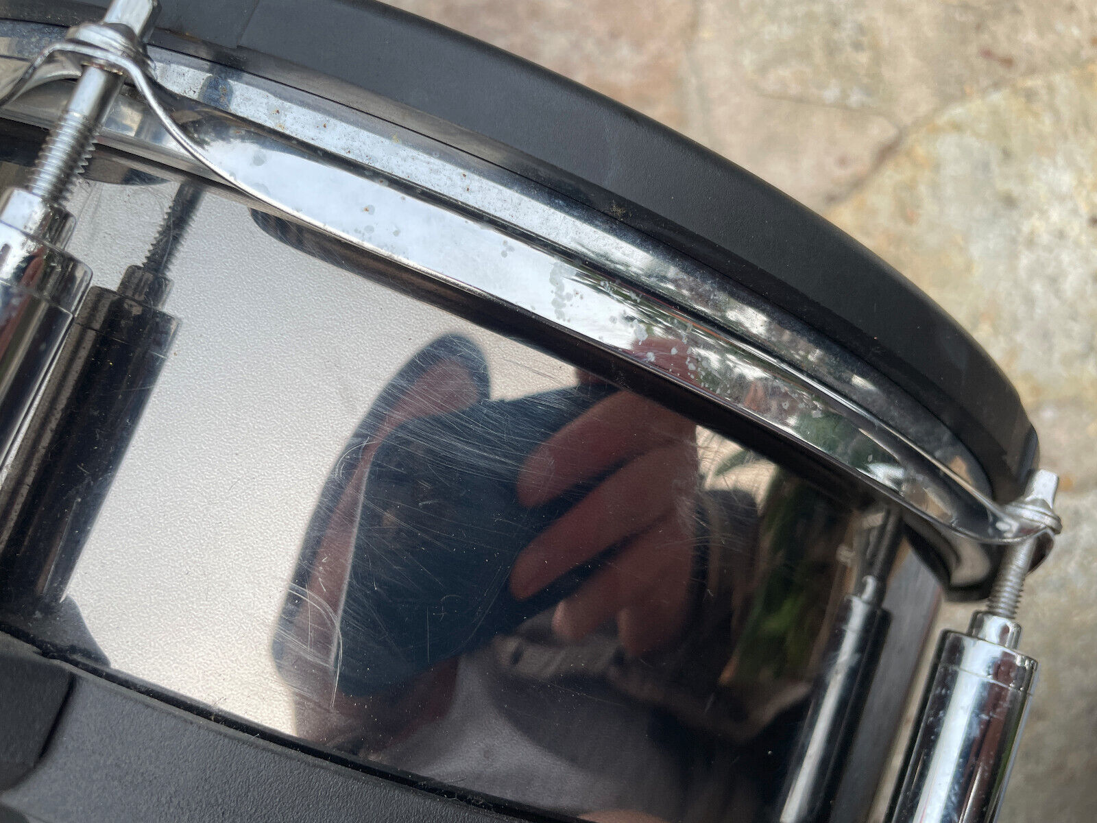 This one is in good/vg condition. Has some marks on the shell wrap and a little more normal wear than excellent i would think. See pictures. Oxidation on the hoop and lugs also . Head is dirty . Discounting due to this
