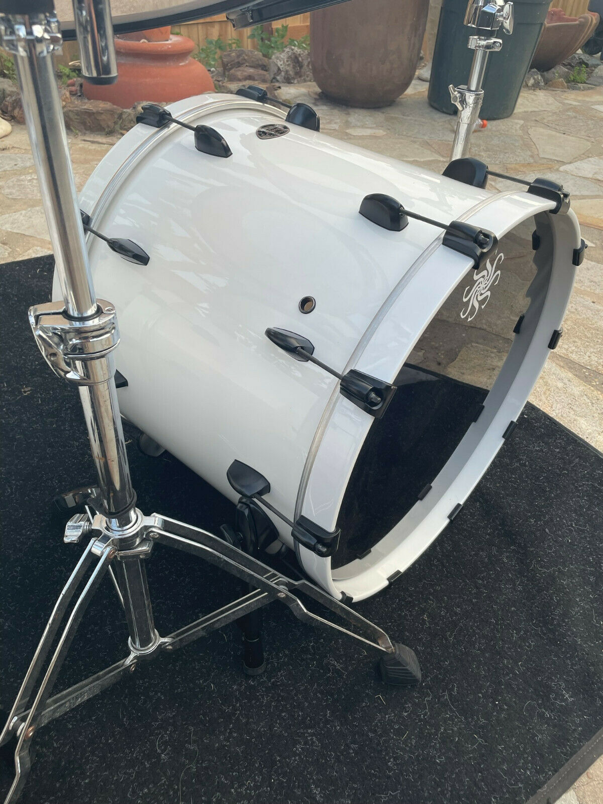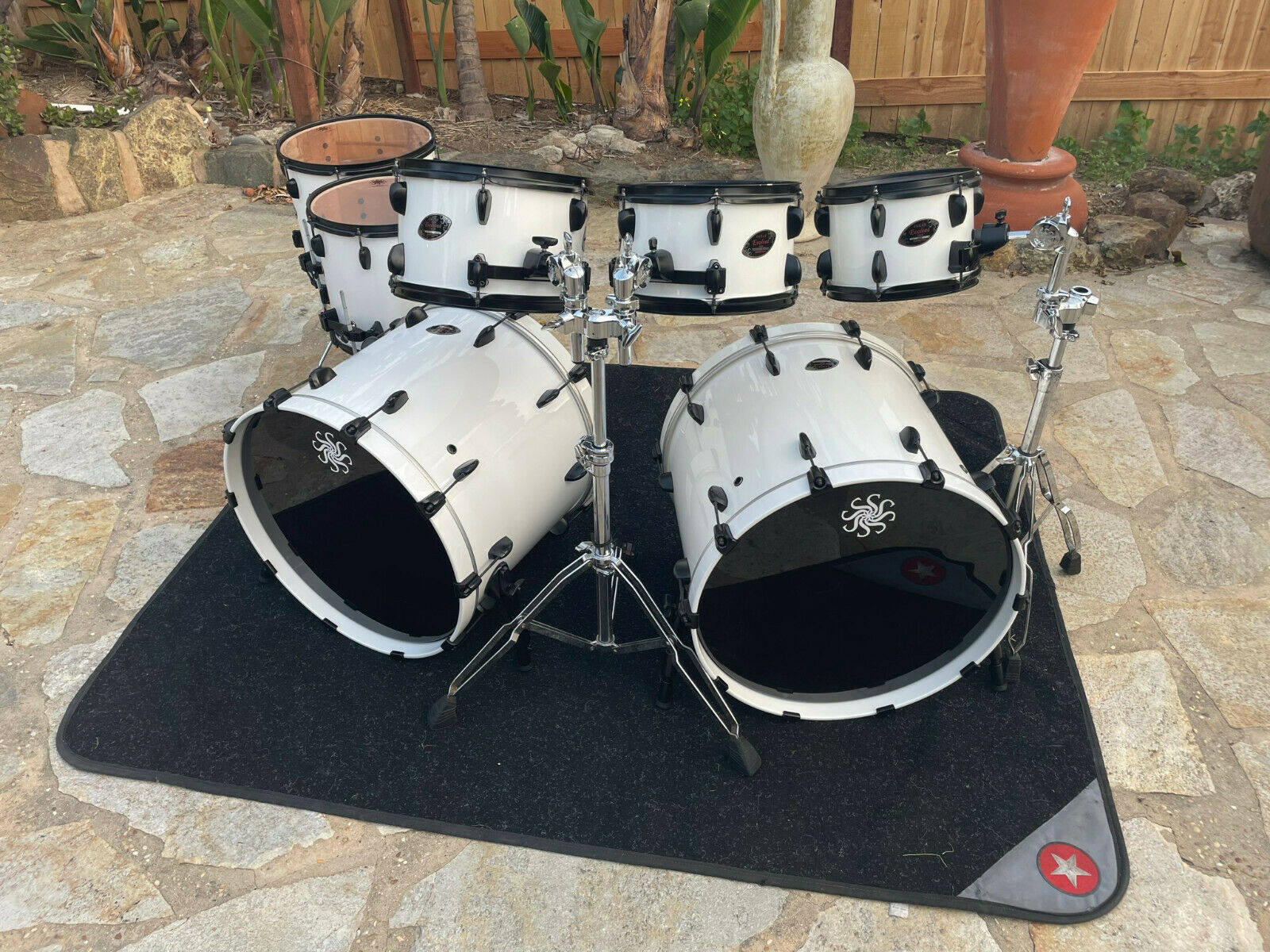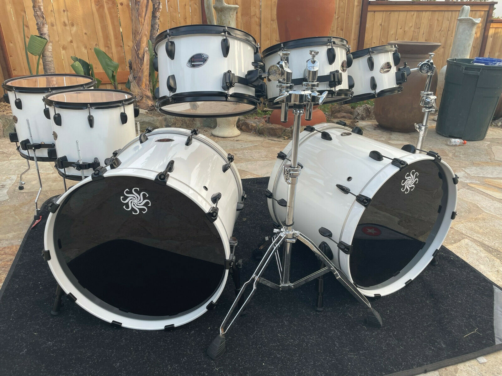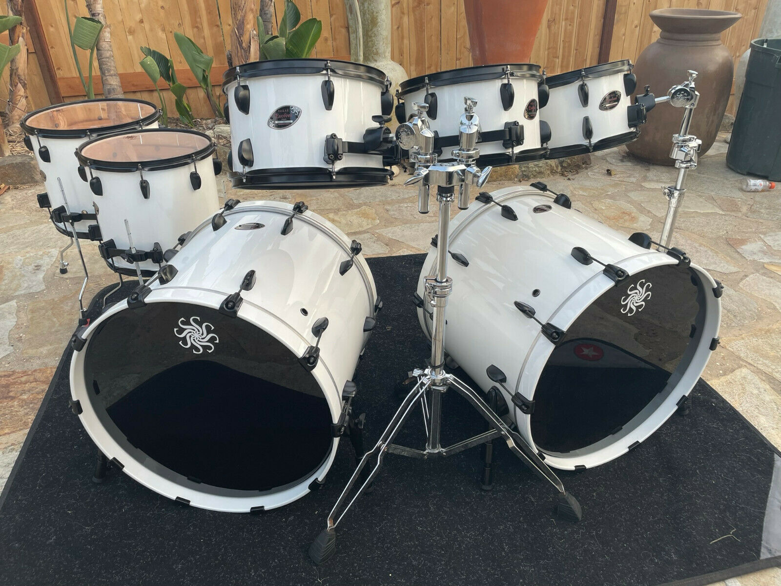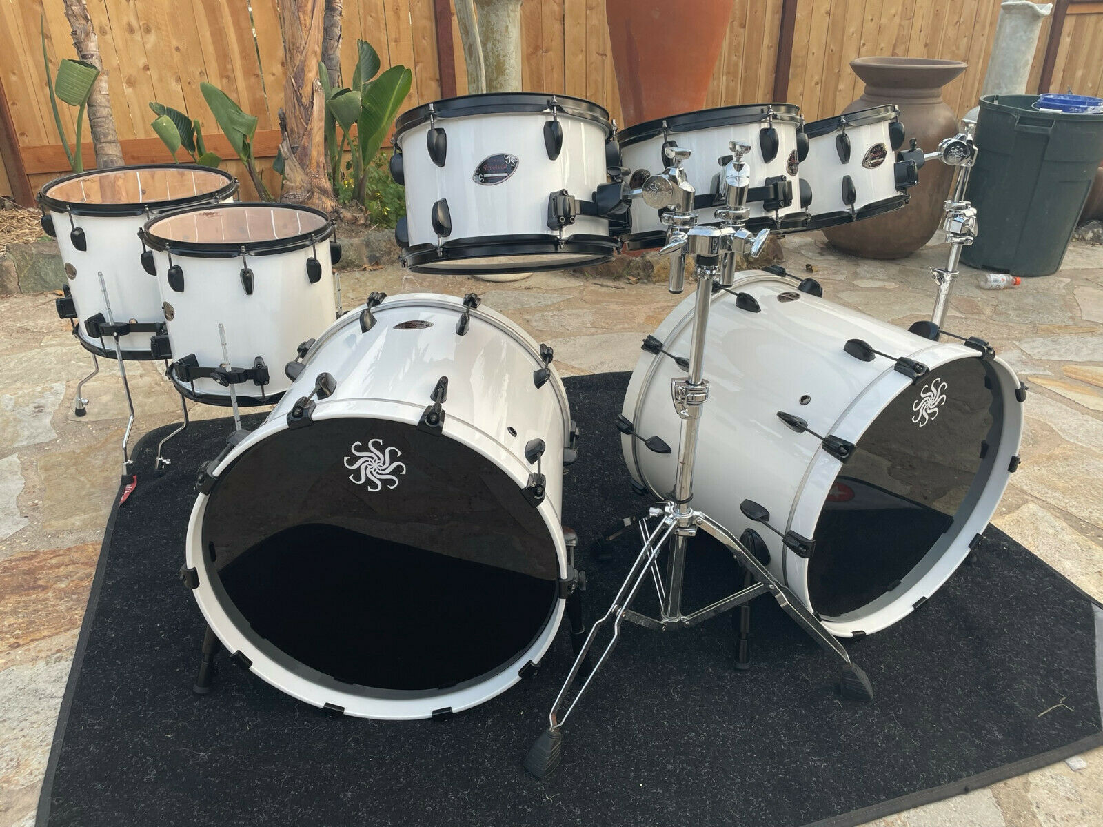 Sakae Evolved Maple 7pc Double Bass Drum Kit - Owned by Dave Mcgraw. Endorsee kit. I got this from him. He currently uses Sakae drums. White finish with black hardware.