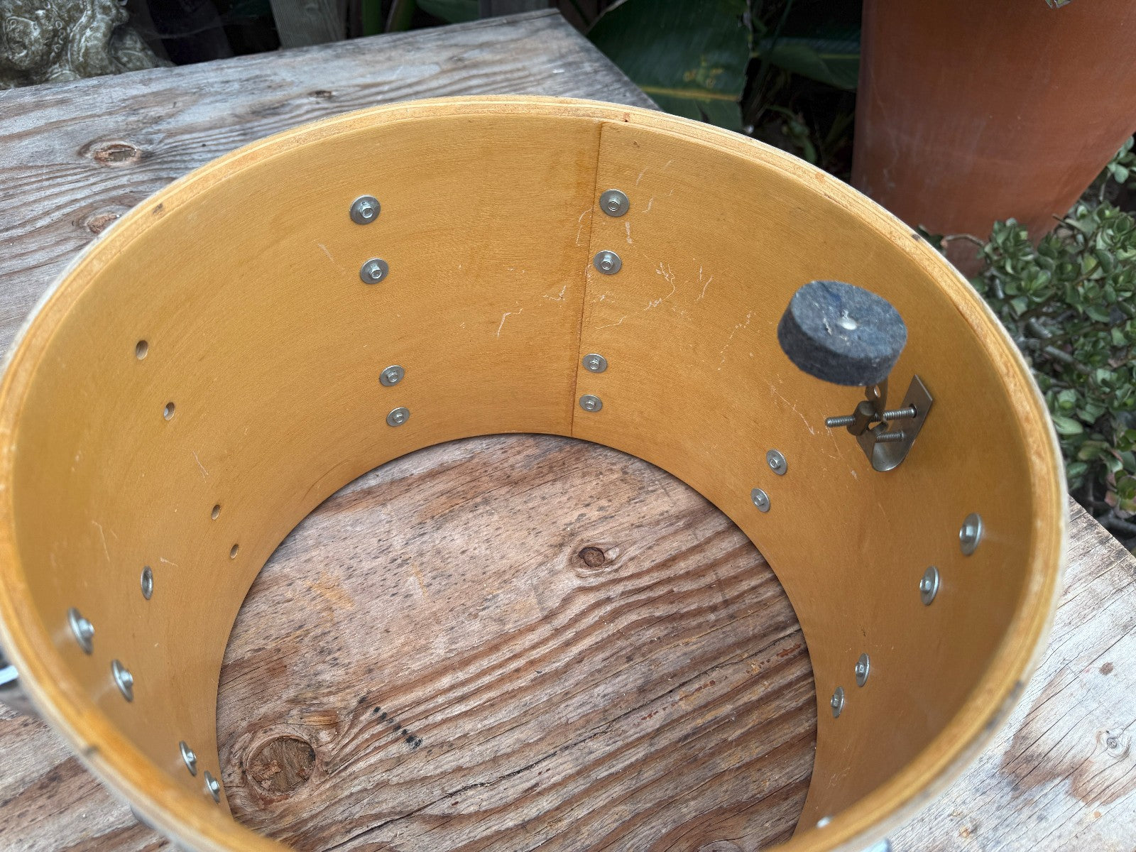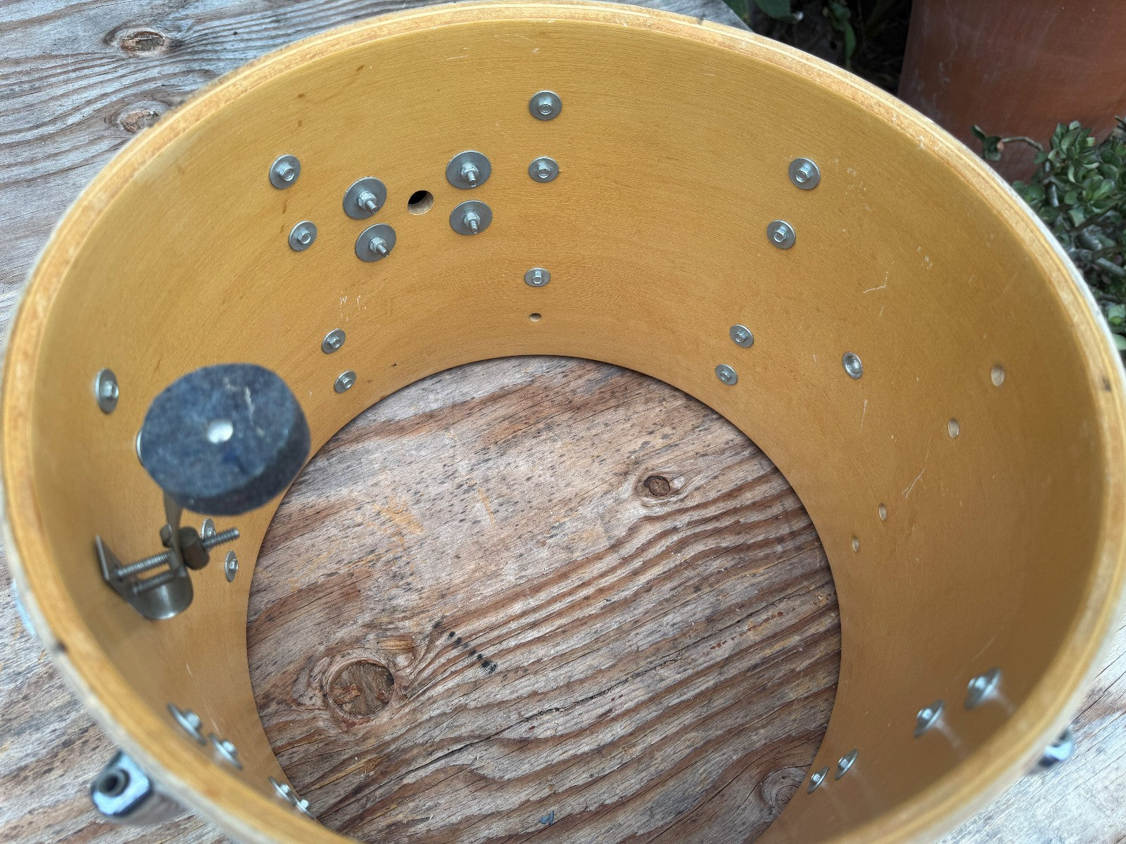 Condition wise looks decent but has aging on the white finish (age / yellowing from being almost 50 years old) and someone added a aftermarket mount so has some unoriginal holes .Also missing top/bottom head / top rim / and tension rods. Missing two other lugs and one lug missing a screw. Otherwise normal wear from use. See pictures for overall condition.