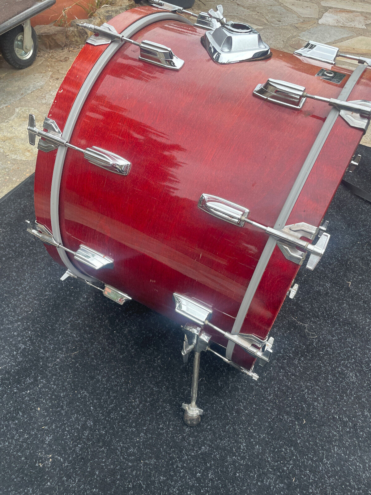 There has Polyurethane wear on the outside and finish. On this bass drum the finish looks uneven on one side from being stored in a case . Color looks brighter on one side more than the other. Has marks also. See pictures
