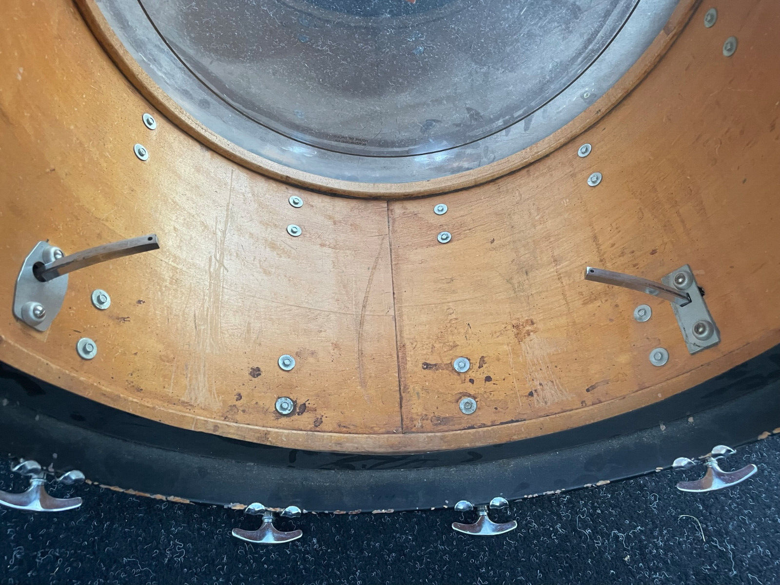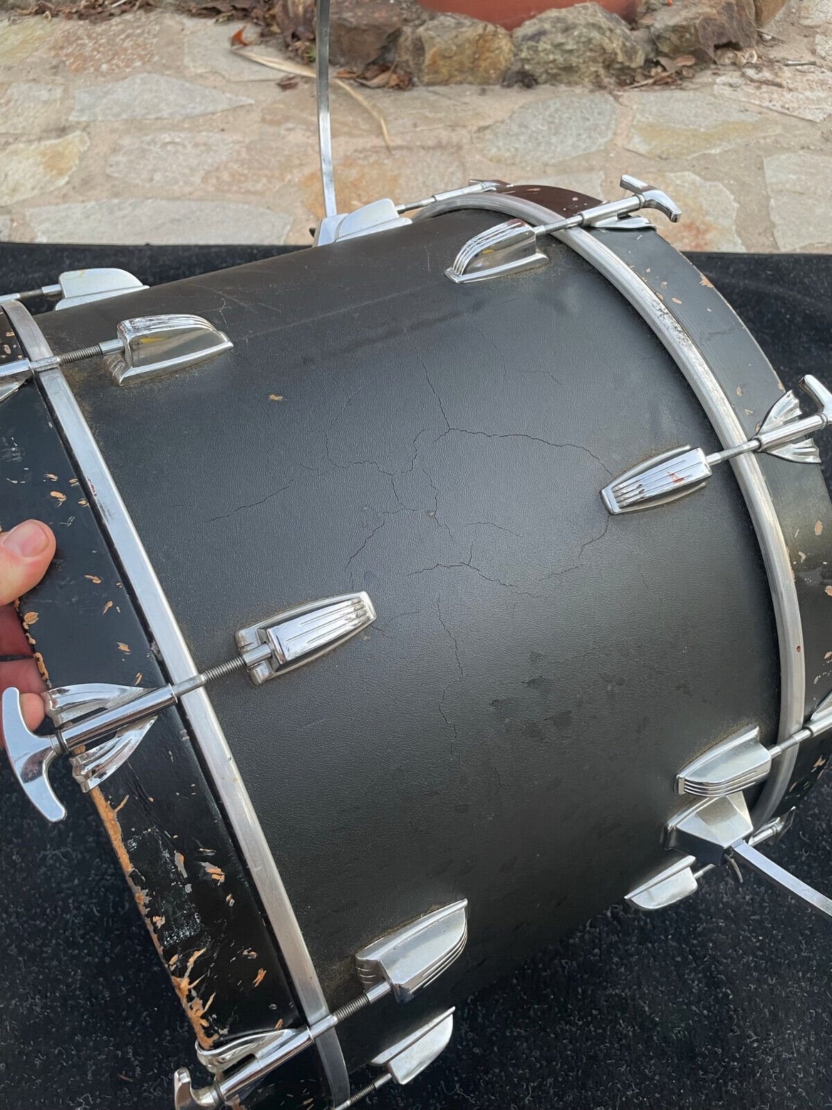 Vintage Ludwig 1976 Black Panther 22 x 14 Bass Drum. Looks mostly original except for the hoops which were changed . Does have cracking on the wrap and paint chipping on the hoops. Front head missing. See pictures for condition