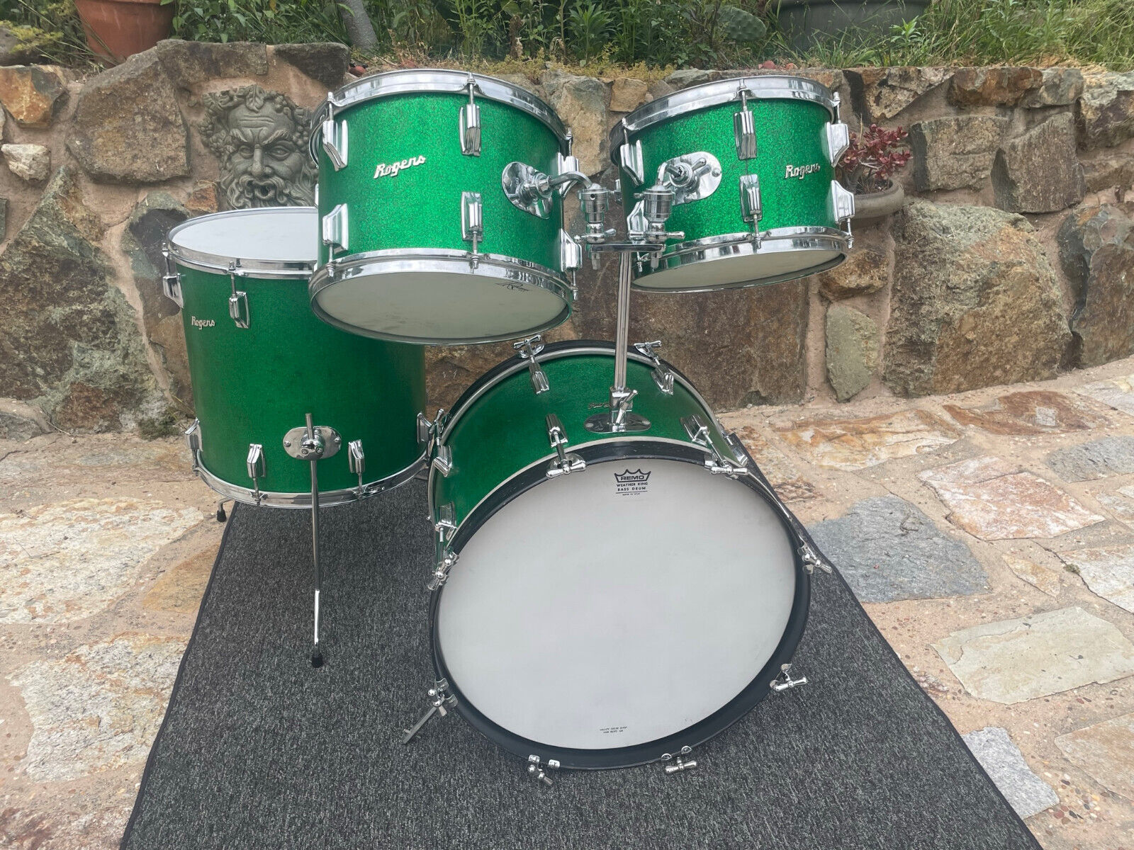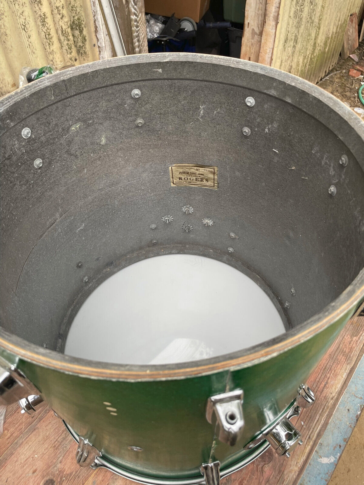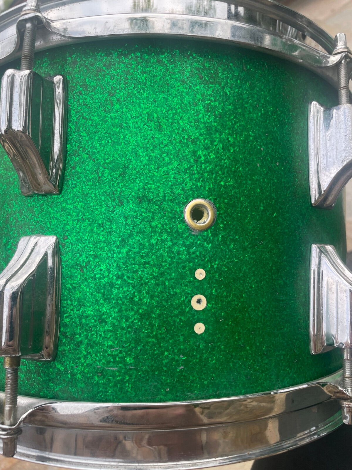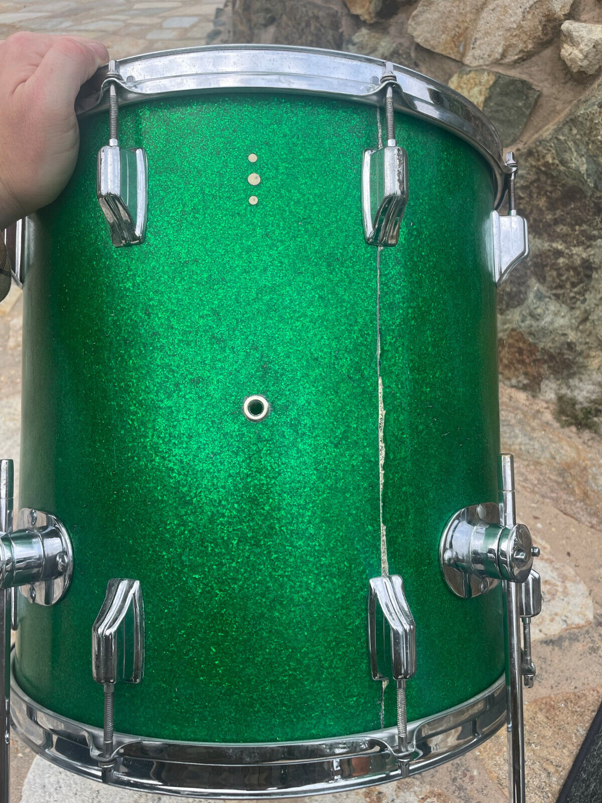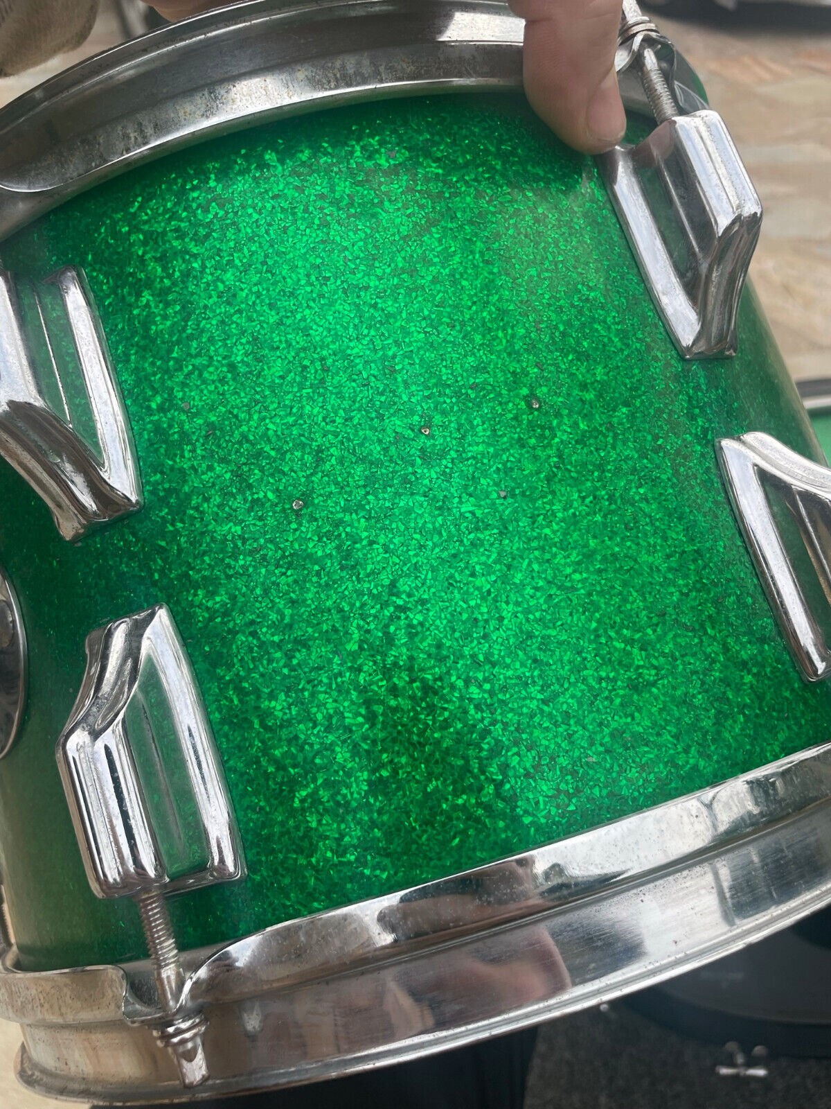 The drums do have scratches / imperfections on the wrap. They were painted at one point and I restored and removed most of the paint but there are spots on all the drums because of this (see pictures of some examples) . Fine scratches and wrap age spots. The interior shells also have paint residue and cosmetic imperfections such as residue from where the mufflers holes were plugged (see last 3 pictures) . So the insides dont look the cleanest with residue also along the bearing edges. Missing mufflers. The badges I reapplied are repros as they were all originally missing... the 12 and 13" actually are supposed to have two badges each but I only added one each (the badge nails I had to bend down as they stick slightly in the inside of the shell). You can add the second badges as the 3 holes are still there but it looks fine without them (see pic) . The bass hoops are missing the green inlays ... you can always put those back. Bass spurs missing rubber tips. Heads are older and could be changed soon. The 16" floor and 13" tom have long rub spots where the wrap is showing white along the seams (see pics) . Some paint residue near the grommet holes also . Bass drum tension rods and claws are not original to the year (bread and butter bass tensions are on the kit)
