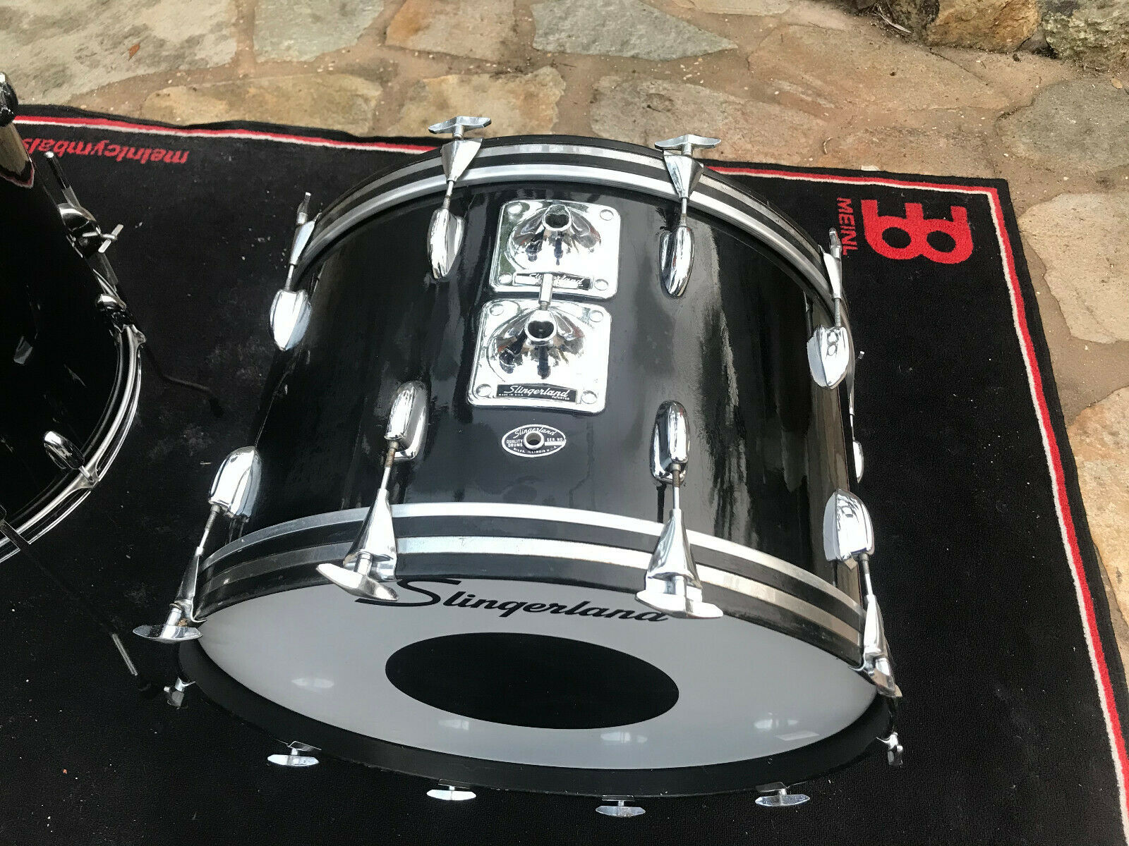 The drums do have a few minor issues. The badges were turn upside down so there is some imprints on the finish from it. Not huge but you can see in the pictures. Some normal wear and use for being over 40 years but and the 12 inch tom has a couple dings on the finish (see last pics) . Also the tom mount i have doesnt fit the bass so doesnt fit the tom mount. Normally these drums have the three toms up top but this comes with two toms but has the 18 which is sought after. Missing muffler knobs . Normal wear and use