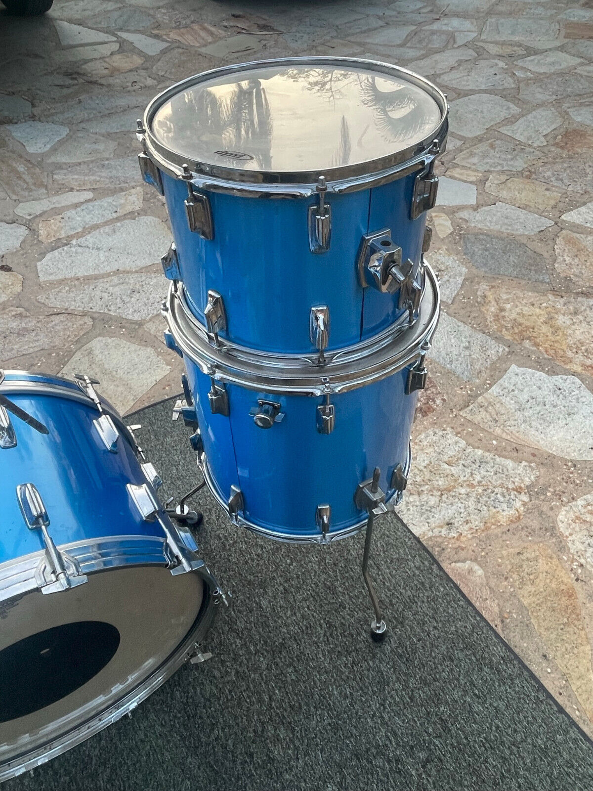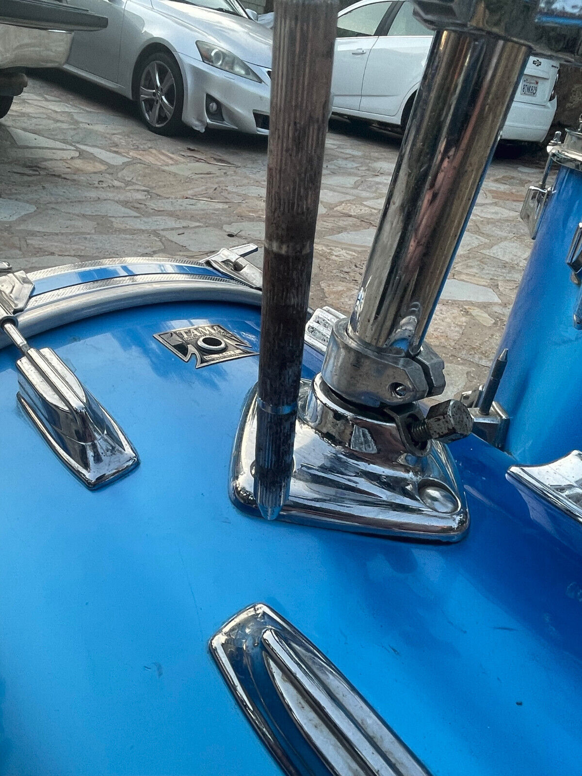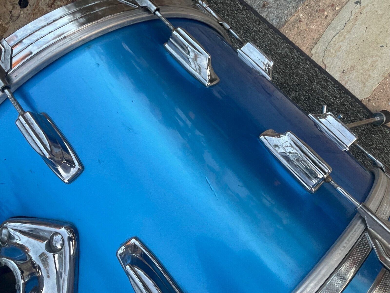 Condition wise it has normal wear for its age. One bass drum blue inlay missing. There is mild rust on the chrome / blemishes on the wrap . Marks here and there on the wrap and cosmetic imperfections. Some rust on the double tom mount. Imperfections here and there for a 40+ year old kit . Some of zola coat worn off on the bottom edge of the 14" as I have to remove some foam that was stuck to the bottom edge but this is only cosmetic. Wing nut for bass drum tom post not original .