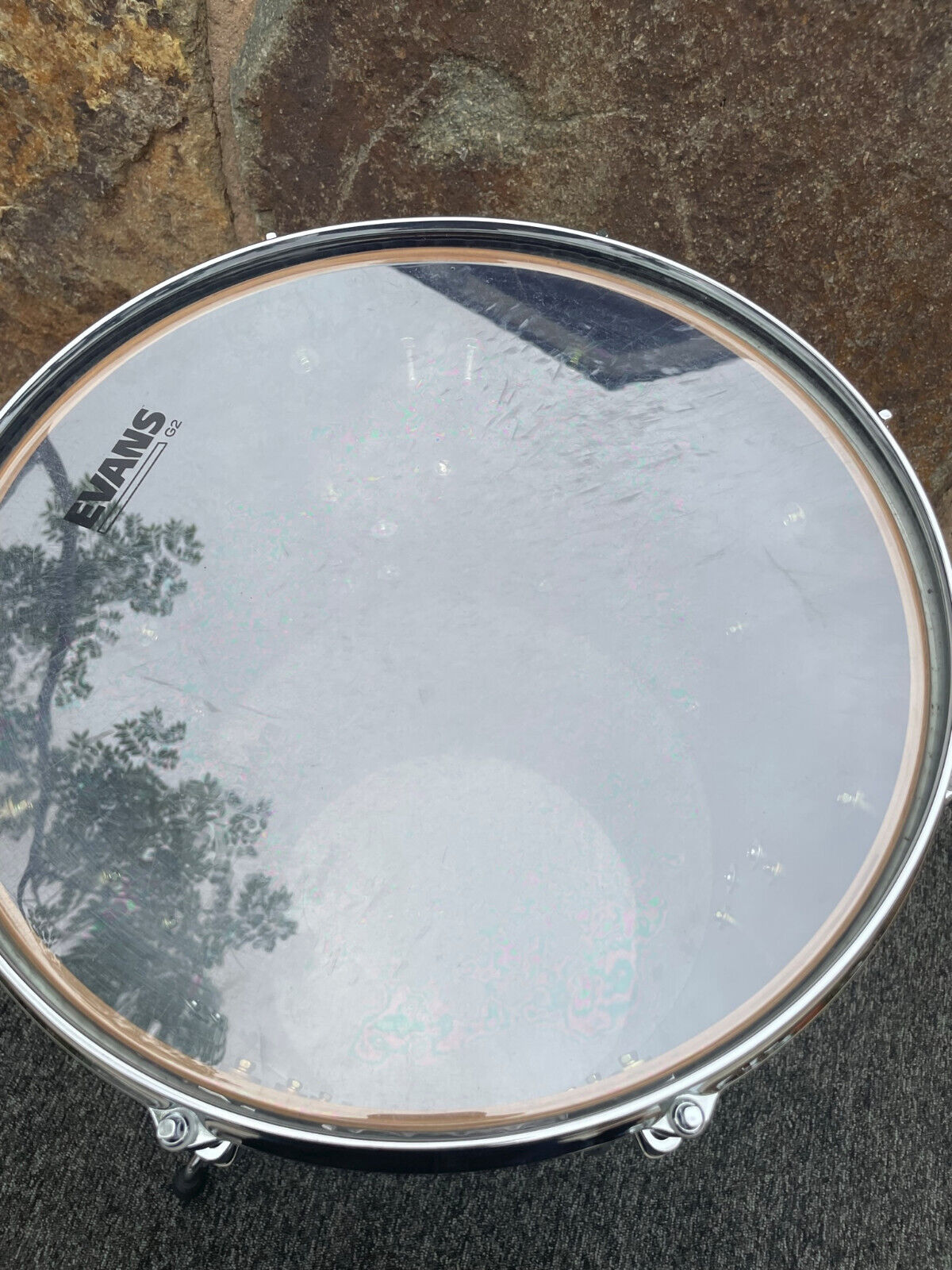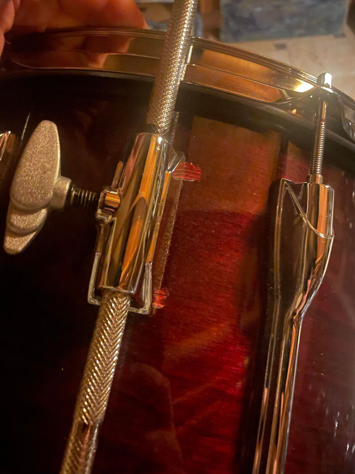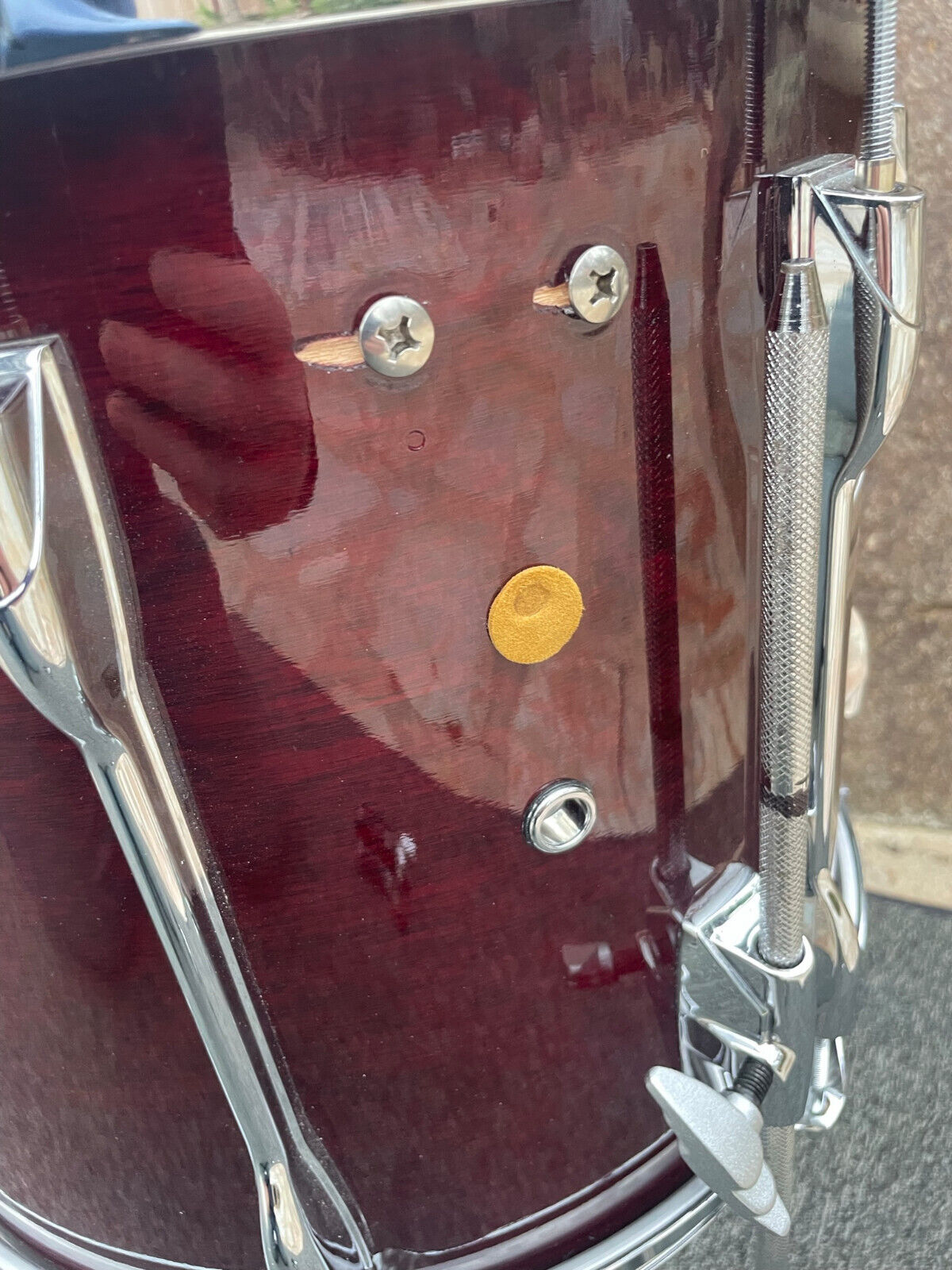The drum was originally a rack tom converted into a floor. There is some wood splitting near where someone originally installed the mounts on the original bracket area and where a floor tom was installed (see pictures)