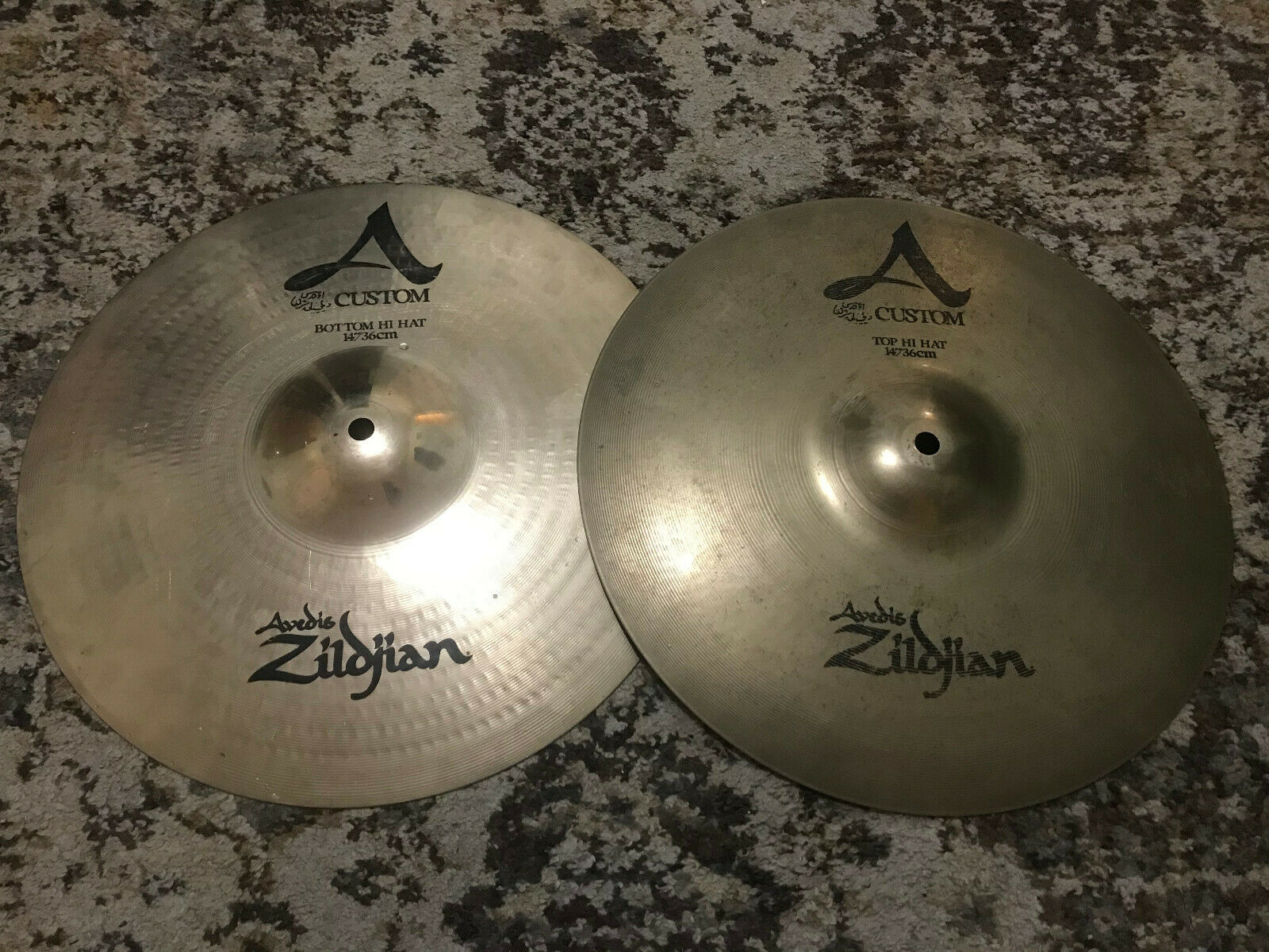 ZILDJIAN A Custom 14" hihat Drum Cymbals hi hat . Some cleaning and normal wear but sounds great